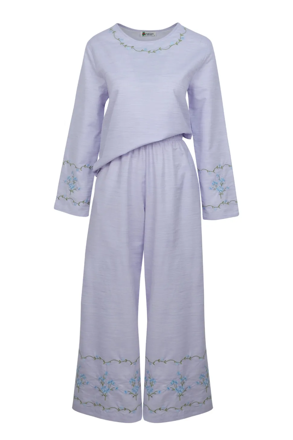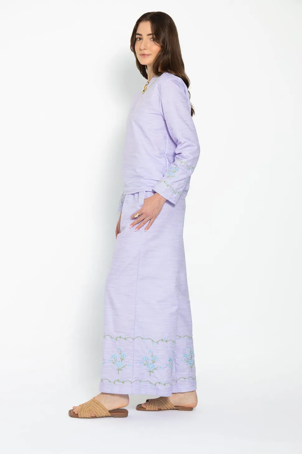 The name Fanm Mon is taken from a Haitian phrase meaning “mountain woman,” reflecting both the founder’s heritage and the spirit of their clothing. Nature’s bounty, fairytale silhouettes, and exploration come together in dresses of outstanding quality, which hold a classic place, yet defy expectations. The Cicek Pants Set is a breezy lilac-toned ensemble embroidered with bright blue florals—equal parts relaxed and refined. Subtle heathered stripes add texture, while the coordinated embroidery brings a cohesive, artisanal finish.