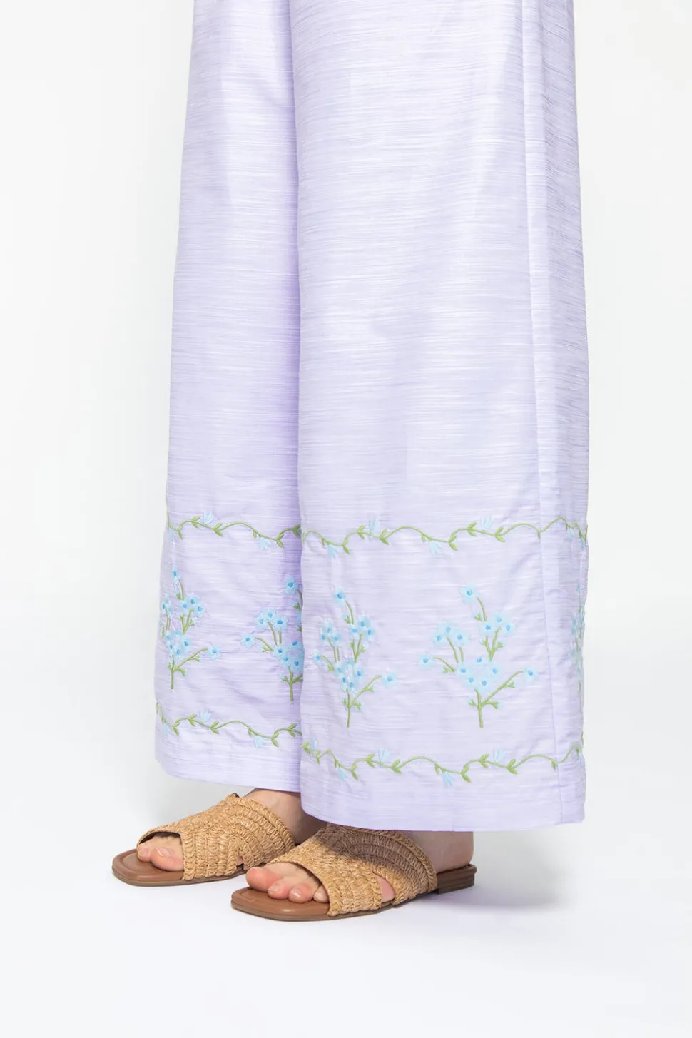 100% cotton. Heathered lilac-striped two-piece pant set. Long-sleeve tunic top features a scoop neckline and bold blue floral embroidery along the neckline and sleeves. Wide-leg pants include an elastic waistband and matching floral embroidery at the hem. Pant length: 42.2″.