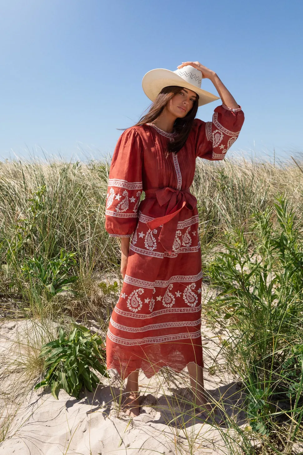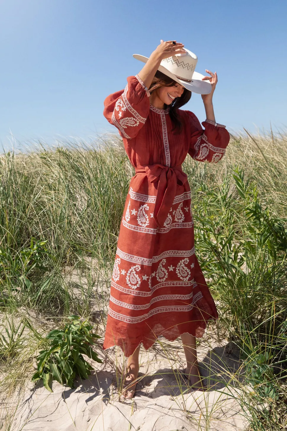 Inspired by art, architecture, and the founder’s global journeys, ASHA by Ashley McCormick introduces bold, sophisticated jewelry and accessories made from only the finest materials. From everyday glamour to the red carpet, these statement pieces are classic additions to your collection. The Cinnamon Piper Dress embraces the season in sun-warmed rust linen, its gauzy weave embroidered with ivory bohemian paisleys along the sleeves, hem, and waist. Billowing sleeves, a tie waist, and a sweeping skirt create a silhouette that balances effortless ease with statement detail—ideal for crisp autumn days. Comes with a separate slip for coverage.