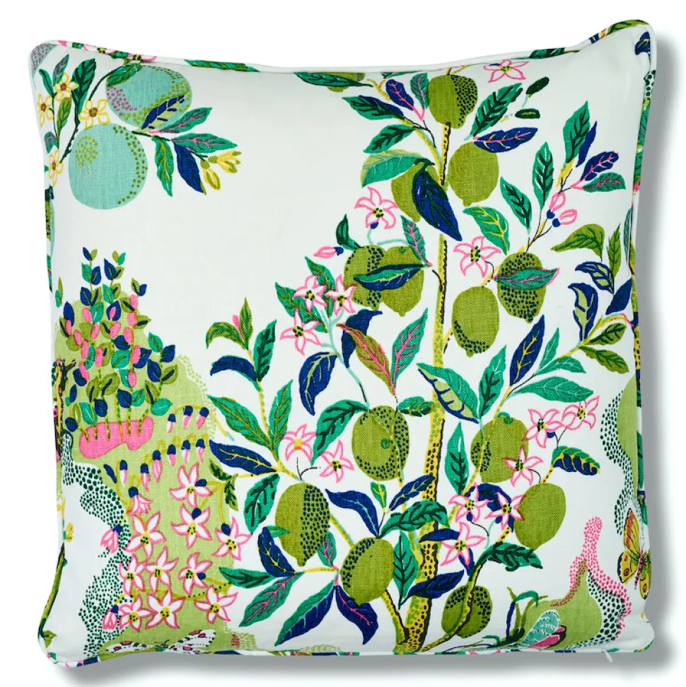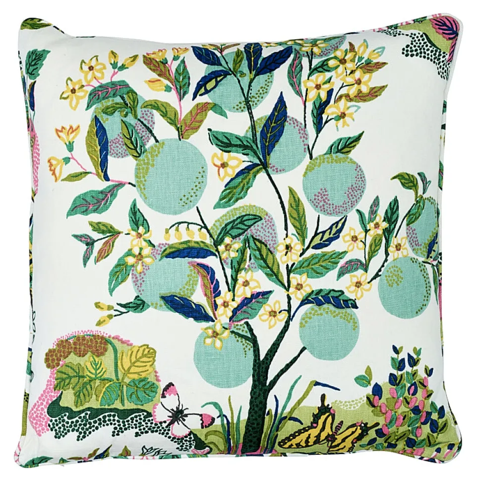 Founded by Frederic Schumacher in 1889 on Fifth Avenue in New York, Schumacher’s designs transcend trends and time with generations-tested unwavering devotion to beauty and quality. Their luxury pillows, fabric, wallpaper, trim, and furniture allow decorators and shoppers alike to create with total confidence. The Citrus Garden 22″ Pillow features a Josef Frank print, created in 1947, which bears the signature whimsy, color, and personality for which the legendary Swedish designer is known. Infinitely charming.
