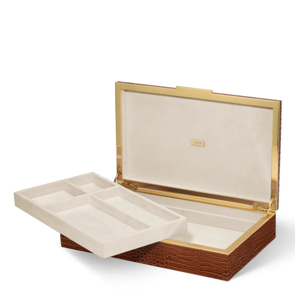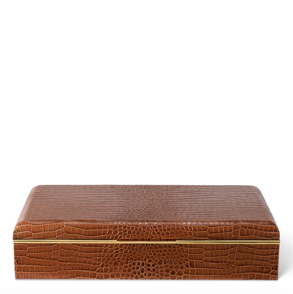 Effortless, beautiful living is what’s important to Aerin Lauder. That ease and refinement shines through in every detail of her collections of beauty products, home decor, and fashion accessories. Keep a desk organized with the Classic Croc Leather Desk Box in Chestnut. This piece features a hinged lid presented in croc embossed Italian leather edged in brass. A removable suede-covered tray is a practical addition, which holds smaller items such as pencils, Post-Its, and paper clips, while envelopes can be stored underneath. A sophisticated way to keep an office in order.