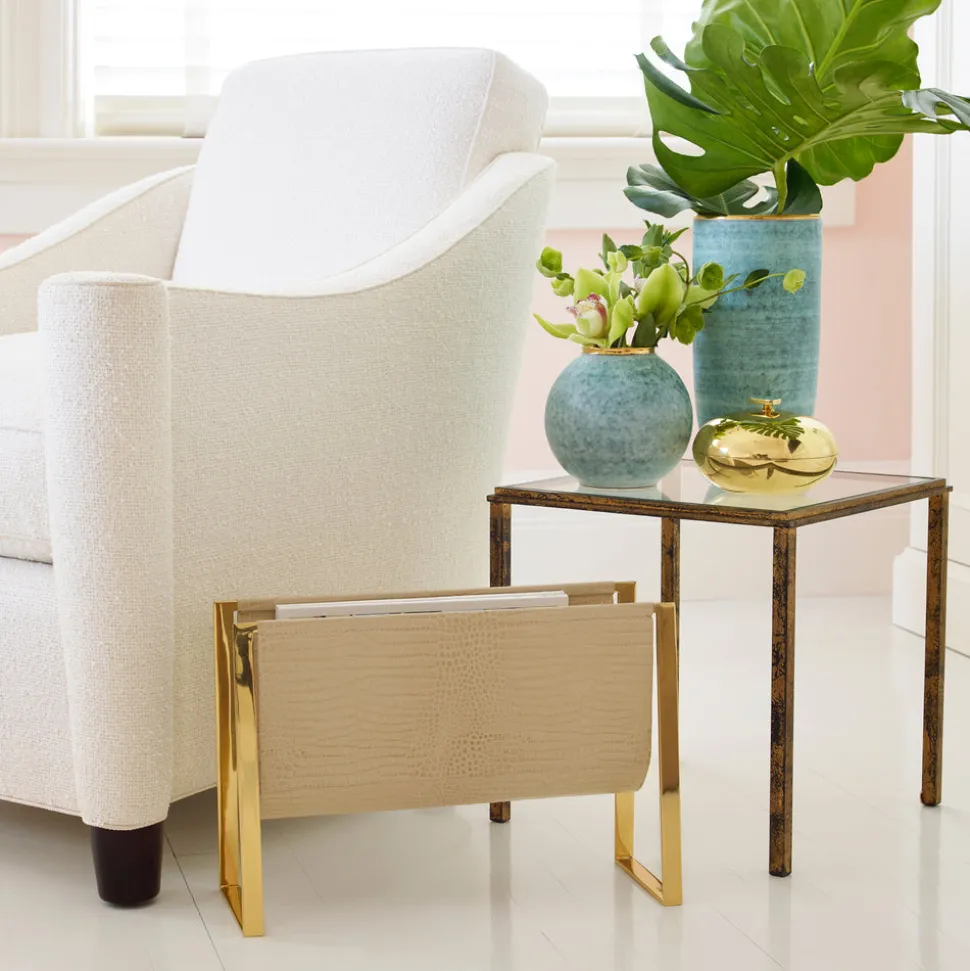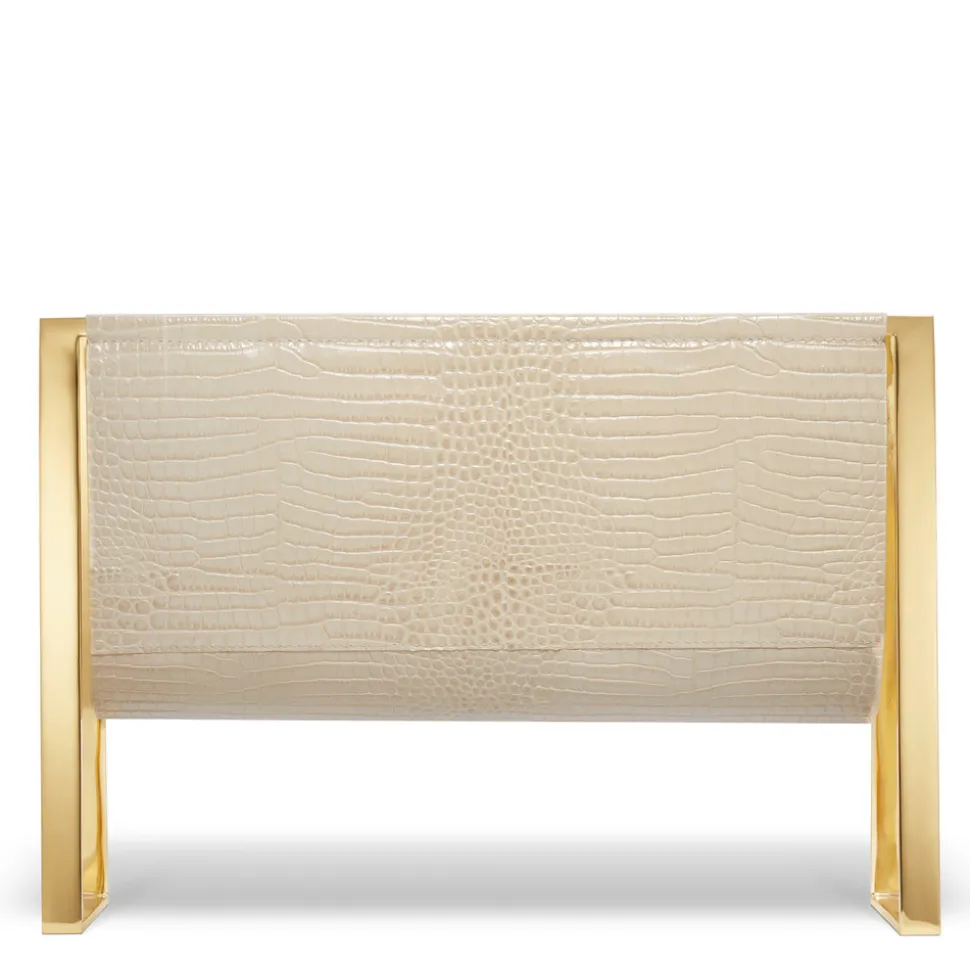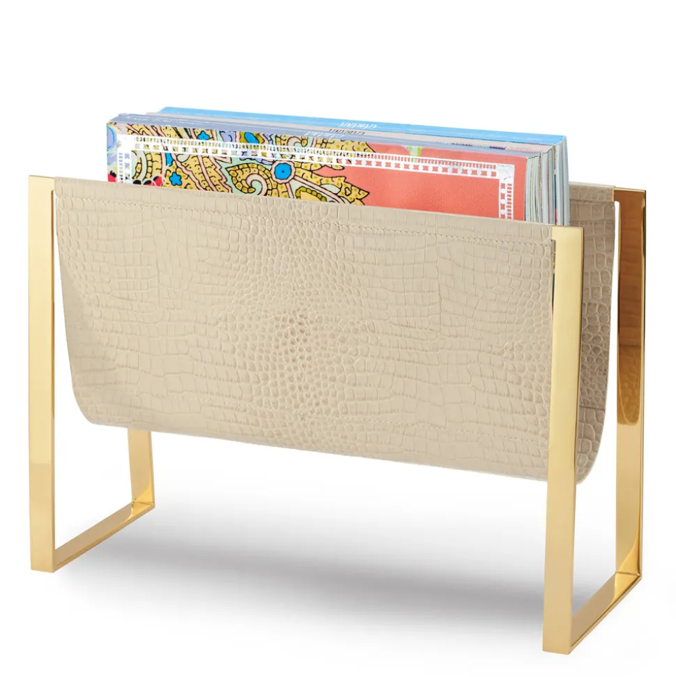 Inspired by Austrian modernism, this beautifully shaped geometric magazine rack is crafted from polished brass and Italian Croc Embossed Leather. A sophisticated addition to an interior.