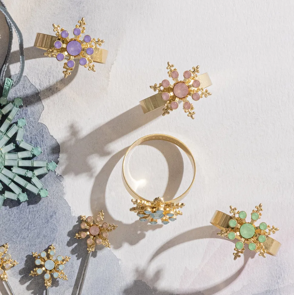 Inspired by her mother’s flare for holiday decorating, Joanna Buchanan has turned her love of travel and knowledge gleaned from twenty years in fashion retail into an eclectic line of tabletop, barware, gifts, and decor. Enjoy unique symbols of the season and enliven your table with the Classic Snowflake Skinny Napkin Rings in Pastel, Set of Four. We love how the gentle pastels work with the traditional snowflake shape.