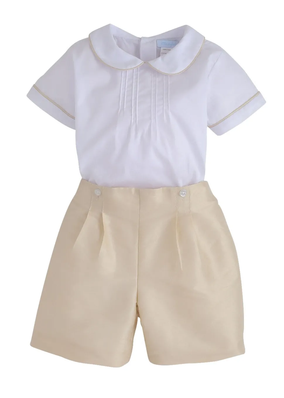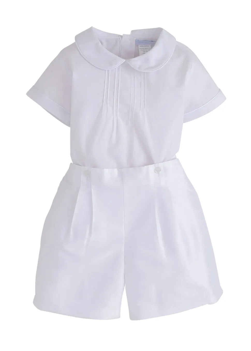 Shannon Latham founded Little English in 2004 with the belief that children should always be well-dressed. Employing hand-smocking, hand-embroidery, and the very best fabrics, Shannon and her daughter design timeless pieces that will be worn for generations to come. Whether it’s a wedding ceremony or just tea with grandma, the Classic Wedding Short Set is the mini formal wear you will continuously reach for. A traditional two-piece, this set boasts a Peter Pan collar, as well as pintucks at the chest and elastic on the waistband.