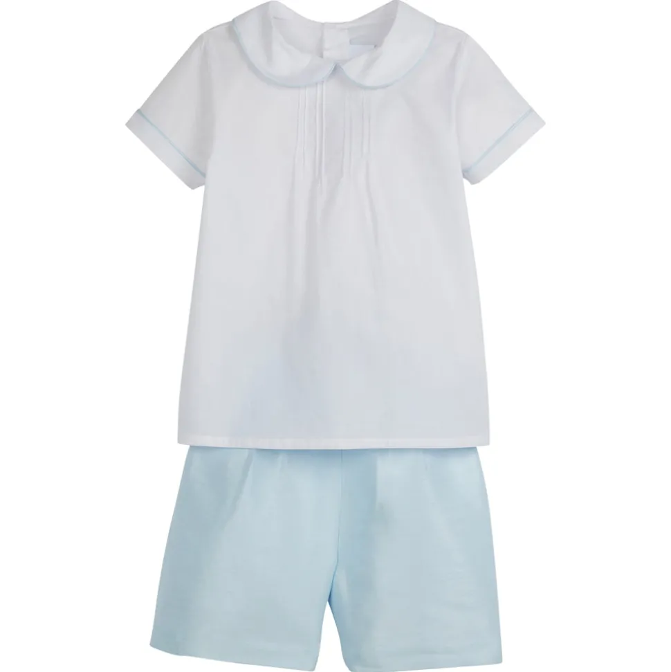 Shannon Latham founded Little English in 2004 with the belief that children should always be well-dressed. Employing hand-smocking, hand-embroidery, and the very best fabrics, Shannon and her daughter design timeless pieces that will be worn for generations to come. The Classic Wedding Short Set in Light Blue celebrates life’s special moments with refined coordination. Available in three colors that complement our bow sashes, this traditional two-piece ensemble features a Peter Pan collar with pintucks at the chest and an elastic waistband at the back for comfort and fit.