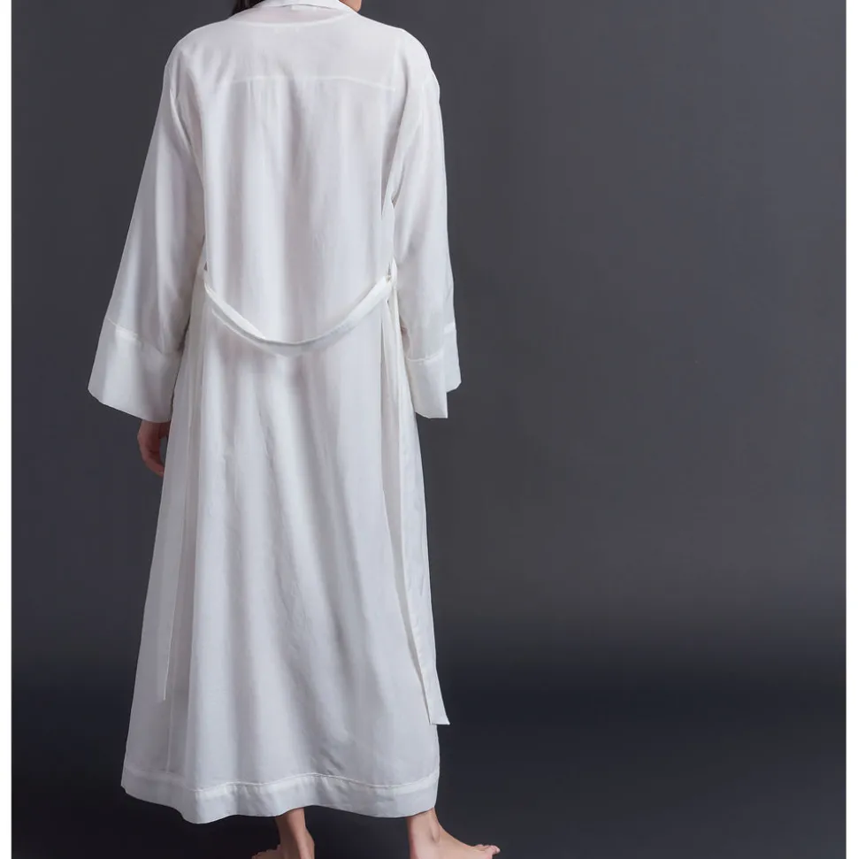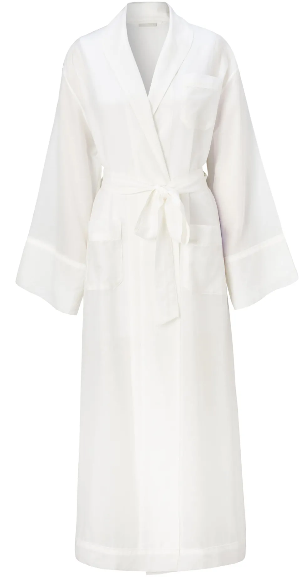 The Claudette Pearl Silk Cotton Robe is a refined take on a classic gentlemen’s robe. Made of softest imported silk cotton voile, the drape and feel of this piece is completely luxurious. Design details include a shawl collar, full length sleeves with cuffs, two front pockets, a self-tie belt, and piping on the pockets, cuffs, and belt. This is the robe you will wear throughout your life, both for its timeless appearance and luxurious feel.