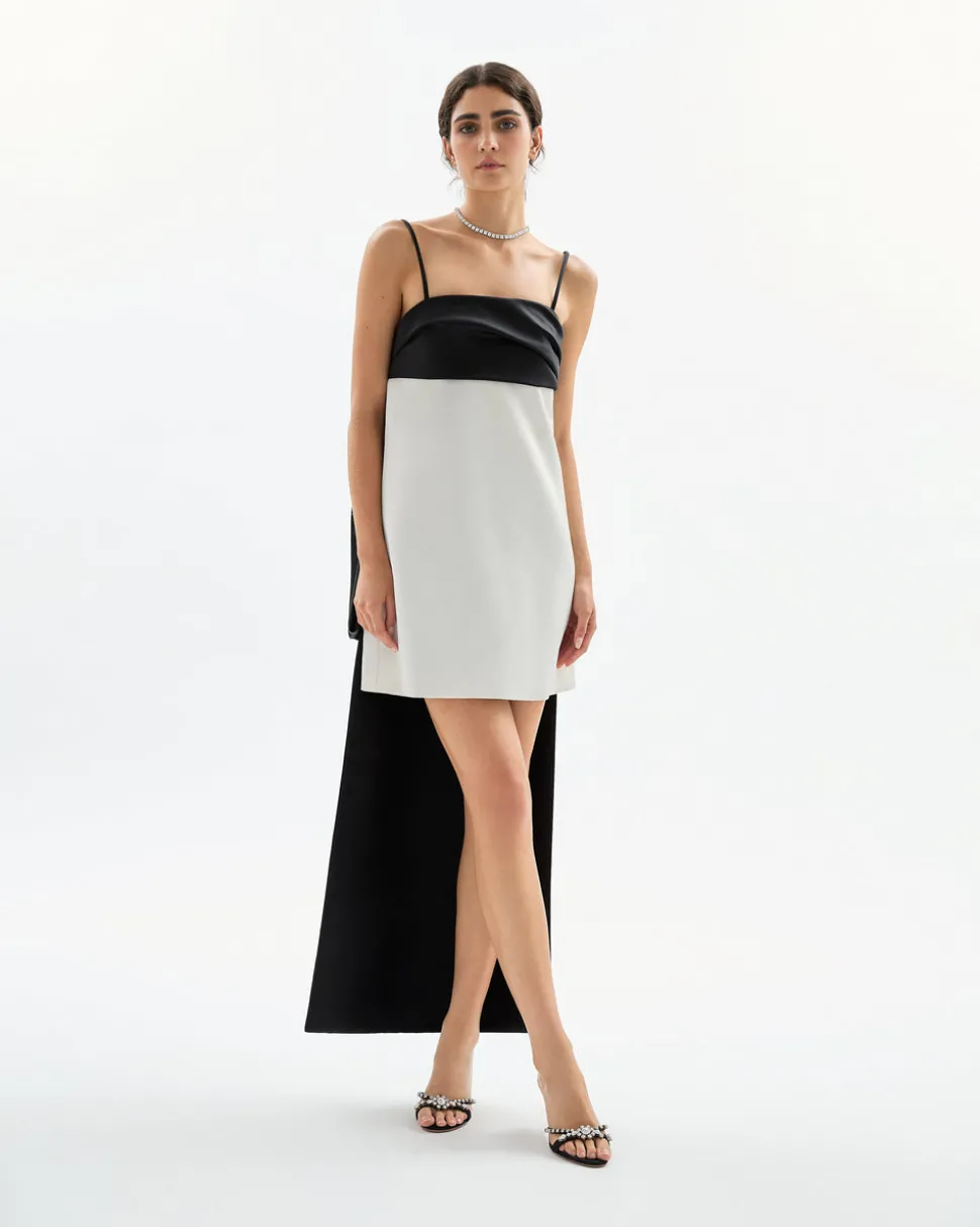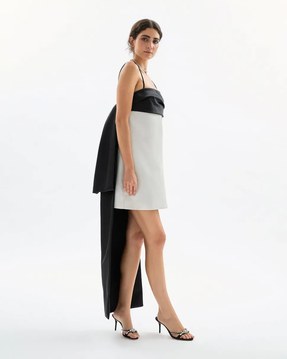 A new line from celebrity favorite Tanya Taylor, Delphine explores the designer’s alter-ego, a sophisticated party-girl sensibility that mixes vintage red carpet glamour with downtown cool—and just the right amount of edge. The Cleo Mini Dress in Noir & Ivory delivers high-spirited glamour in a mini silhouette with a draped bustline and a modern sculptural train, designed for unforgettable entrances and after-hours adventures.