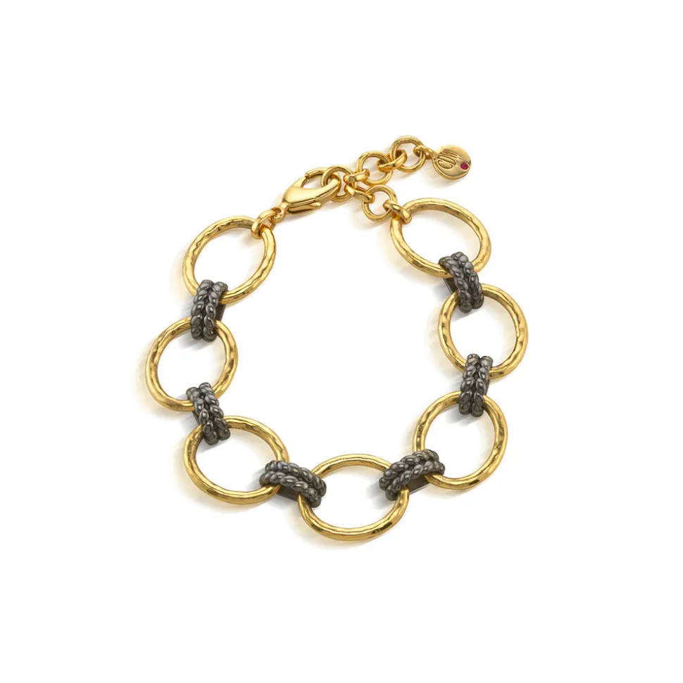 Half-Parisian, half-Texan, Capucine De Wulf’s unique upbringing was the inspiration for her namesake jewelry line. Her accessories combine French romance with an American sensibility. A statement piece of unapologetic feminine power, the Cleopatra Grande Link Bracelet features an elegant braided motif and oversized links wrought in radiant hammered gold and linked with luscious black rhodium. Like a gilded chariot, this bracelet is a reminder to go forth boldly.