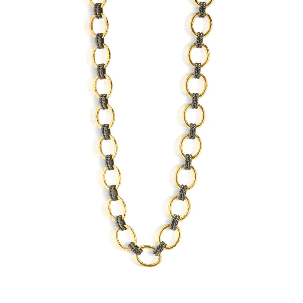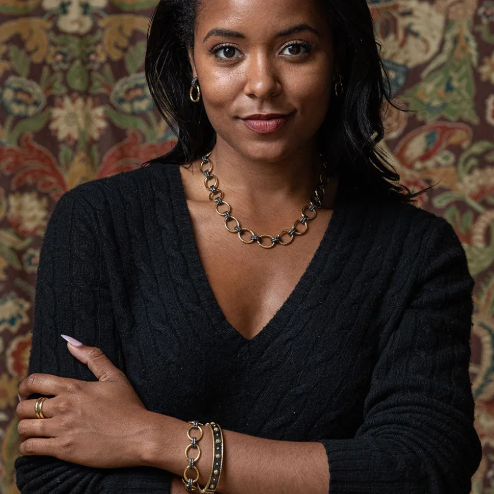 Half-Parisian, half-Texan, Capucine De Wulf’s unique upbringing was the inspiration for her namesake jewelry line. Her accessories combine French romance with an American sensibility. A statement piece of unapologetic feminine power, the Cleopatra Grande Link Necklace features an elegant braided motif and oversized links wrought in radiant hammered gold and linked with luscious black rhodium. Like a gilded chariot, this piece is a reminder to go forth boldly.