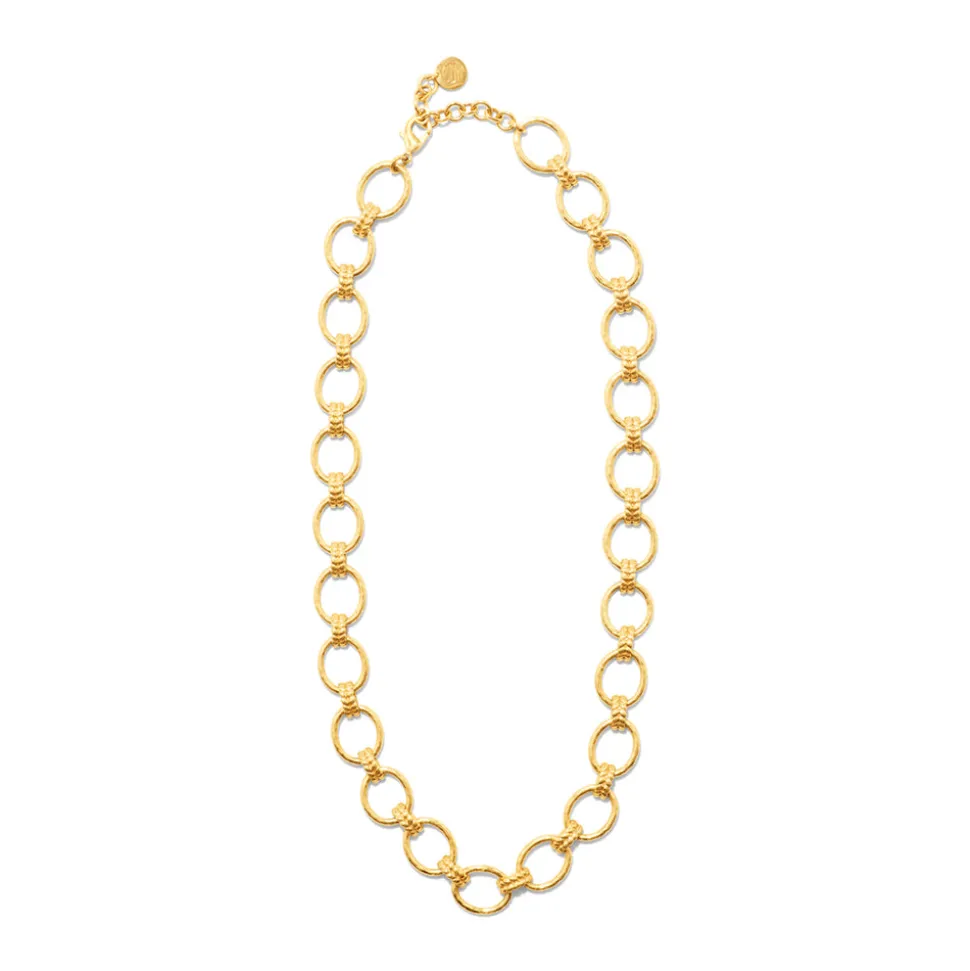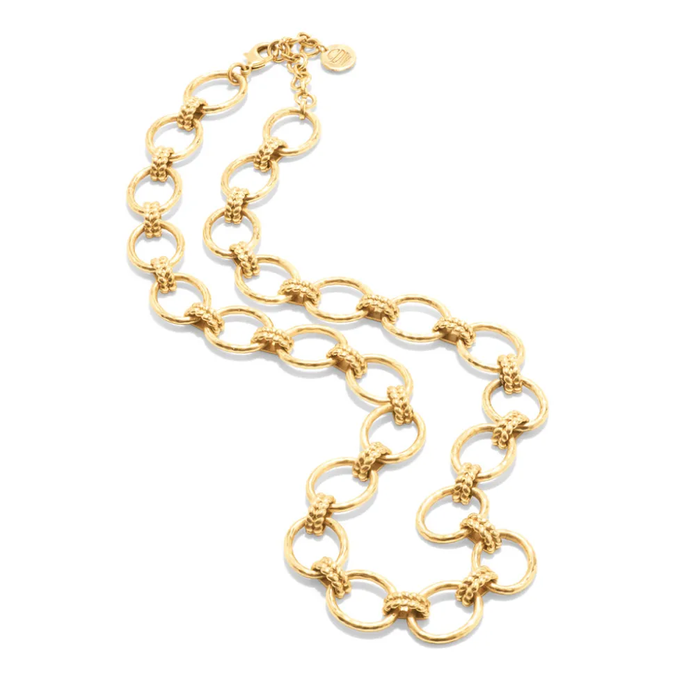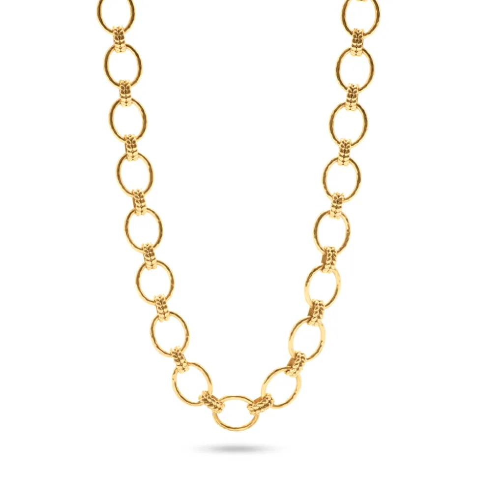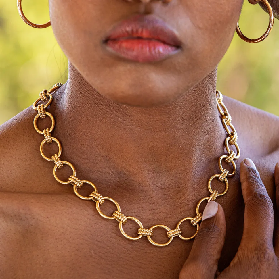 Half-Parisian, half-Texan, Capucine De Wulf’s unique upbringing was the inspiration for her namesake jewelry line. Her accessories combine French romance with an American sensibility, as in the Cleopatra Grande Link Necklace in Hammered Gold. An unapologetically feminine statement piece, this link necklace features a gorgeous braided motif and oversized links wrought in radiant hammered gold. The best news: from a crisp tee to cocktail attire, it goes with everything.
