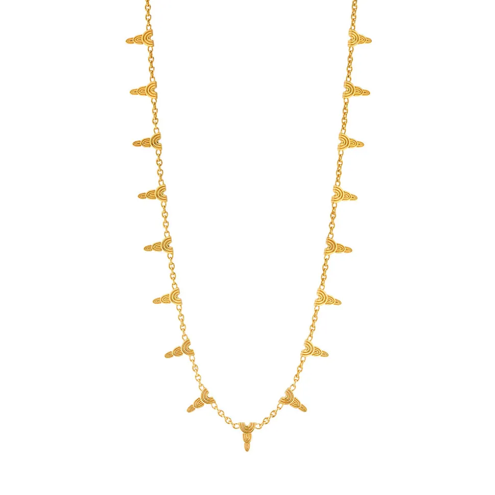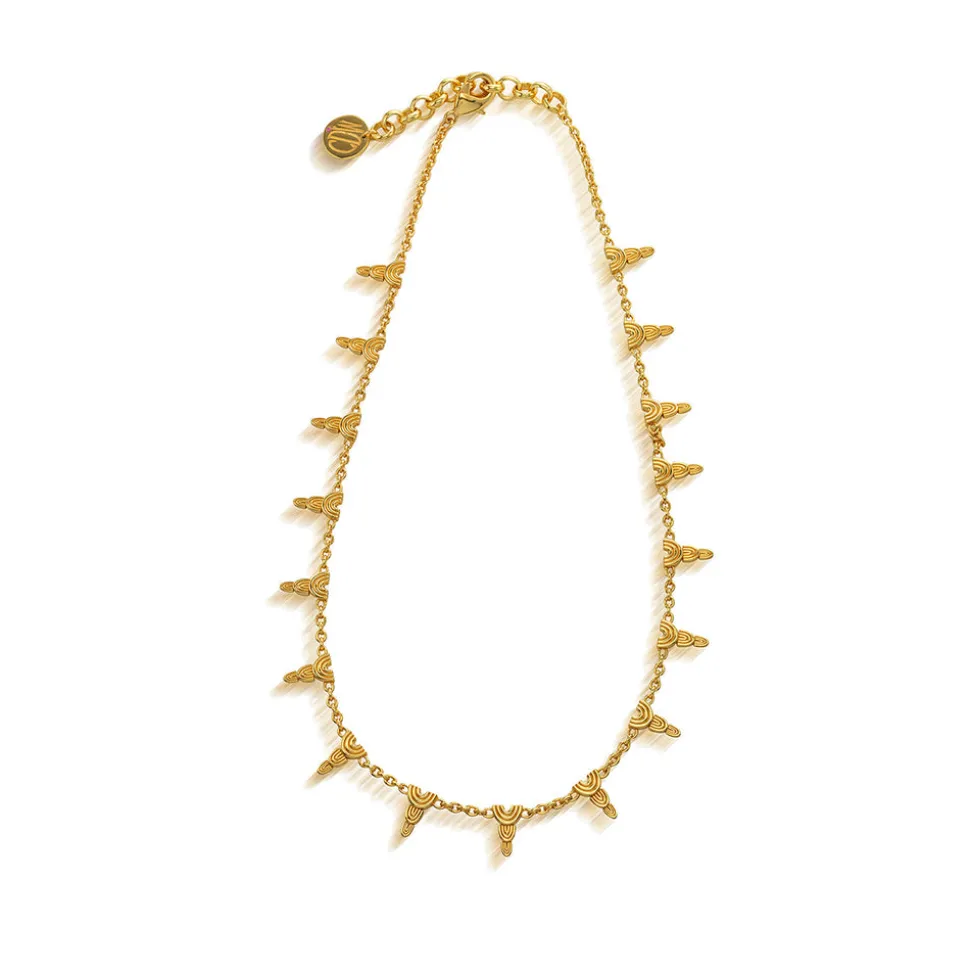 Half-Parisian, half-Texan, Capucine De Wulf’s unique upbringing was the inspiration for her namesake jewelry line. Her accessories combine French romance with an American sensibility. This radiant chain is decorated with ornate sun ray motifs inspired by the ancient Egyptian sun god, Ra. Falling lightly at the collarbone, this piece embellishes your everyday crewneck, structured workwear, or elegant cocktail attire and is unlike anything in your jewelry box.