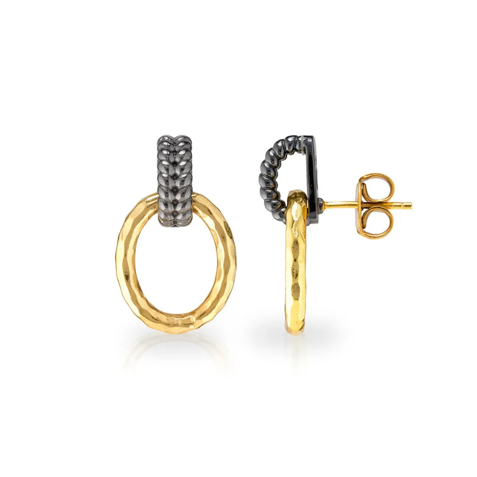 Black rhodium. 18K gold over brass with anti-tarnish coating.