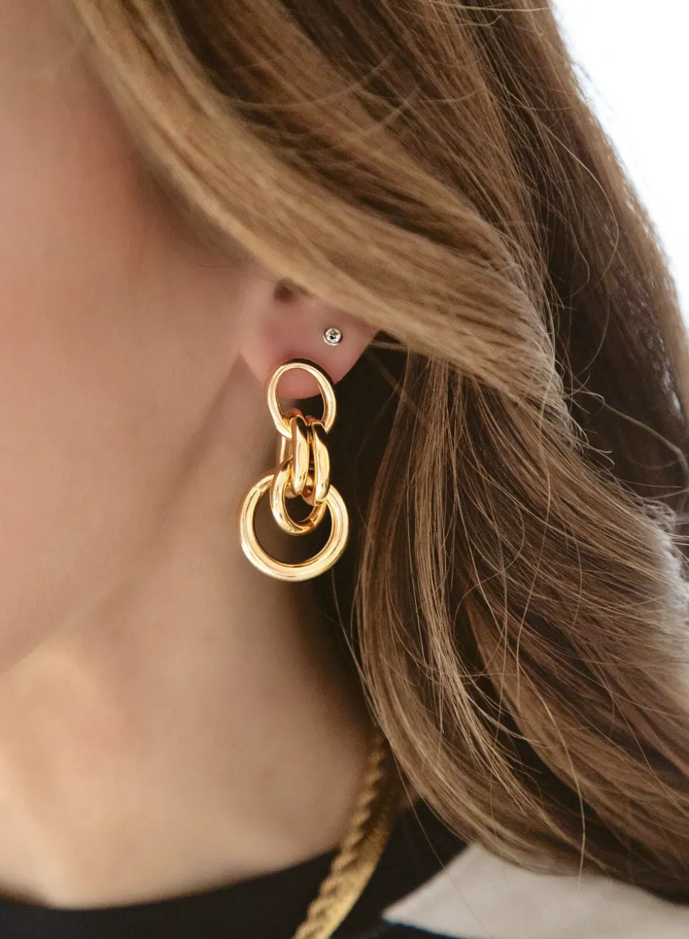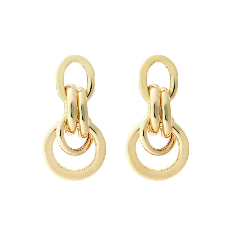 Featherweight. 24K gold-plated or gold-plated and rhodium-plated interlocking rings and toppers on stainless steel hypoallergenic posts.