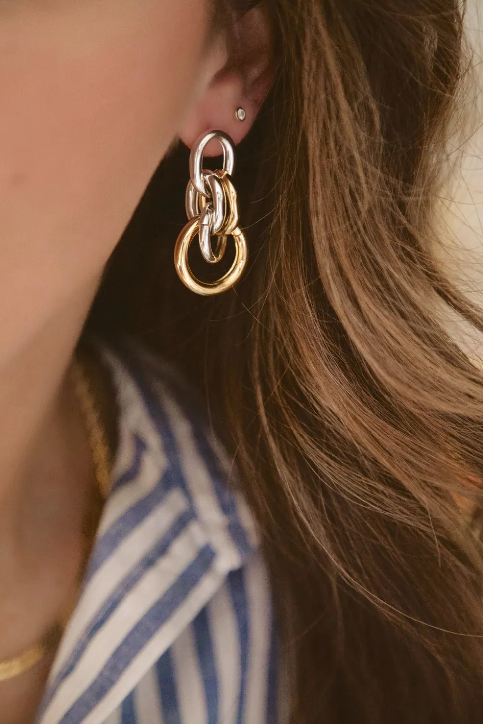The mother-daughter duo behind Brinker + Eliza combine their experience in metalsmithing and fashion to create incredibly unique jewelry that feels custom-made. Employing pearls, shells, and earth’s most prized organic forms, these are pieces to be not just worn but treasured. With interlocking rings and metals of your choosing, the Collins Earrings is a structural addition to your everyday look.