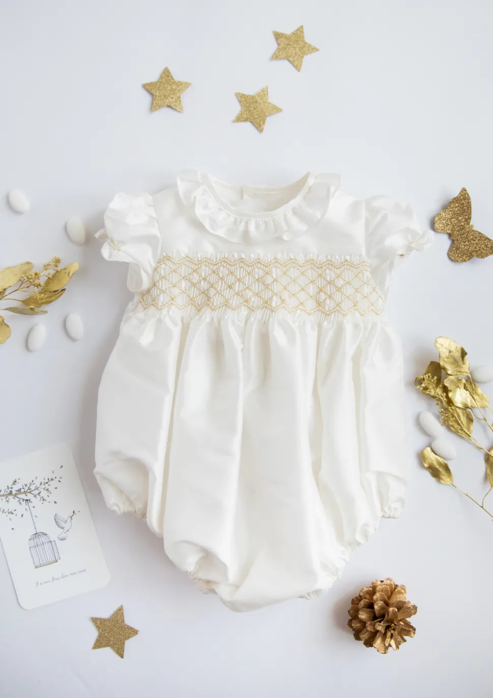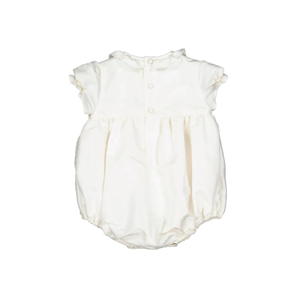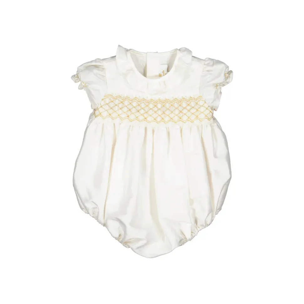 Double layer 100% cotton. White French silk handmade smocked bubble with short puffed sleeves. Golden embroidery on the chest and waiving frills collar. Snap fastening between the legs for easy changing with soft internal elasticated at leg hem.