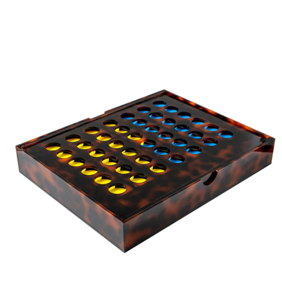 Maison Games makes beautifully crafted versions of your favorite games—backgammon, chess, connect four—that provide not only hours of fun and entertainment, but artful, colorful statements to any room in the home. Designed in a classic tortoise shell acrylic, you can enjoy Connect Four at home or on the go, as this set folds into an easily transportable box shape.