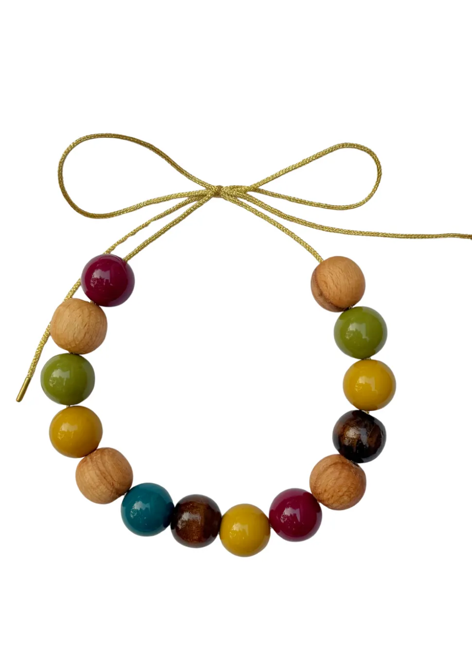 Gold lurex cord. Bubblegum ball beads. Adjustable length. Beads can be rearranged. Dye lot of beads and wood may vary.