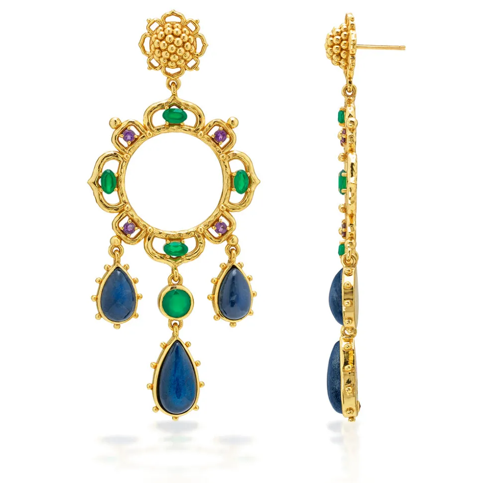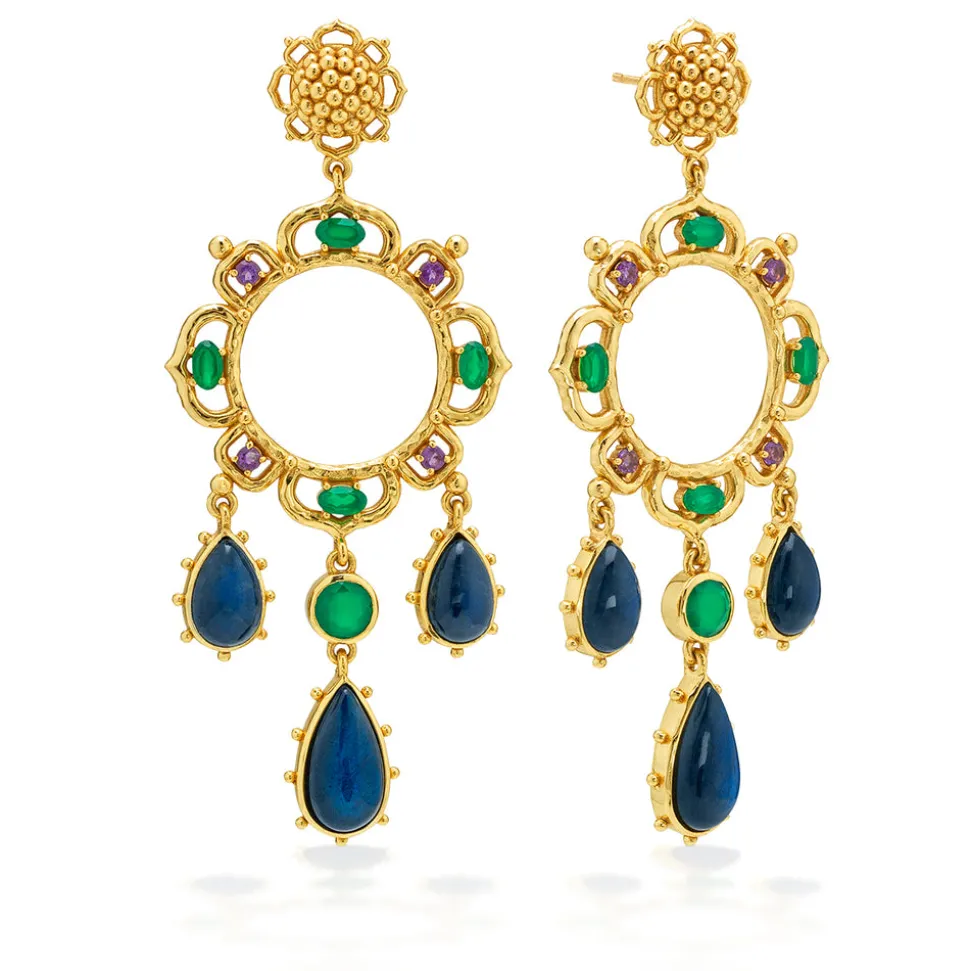 Half-Parisian, half-Texan, Capucine De Wulf’s unique upbringing was the inspiration for her namesake jewelry line. Her accessories combine French romance with an American sensibility. The Contessa Belle Nuit Dangle Earrings draw from the grandeur of Byzantine courts, with dewdrop-shaped blue labradorite stones cascading from gilded medallions set with amethyst and green onyx. Suspended within ornate Moorish silhouettes, these luminous earrings move gracefully with every step, bringing regal radiance to any occasion.