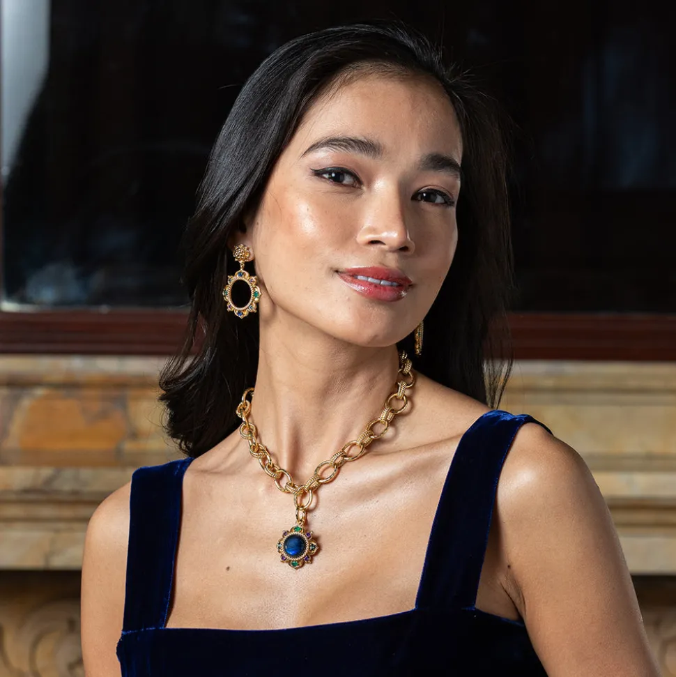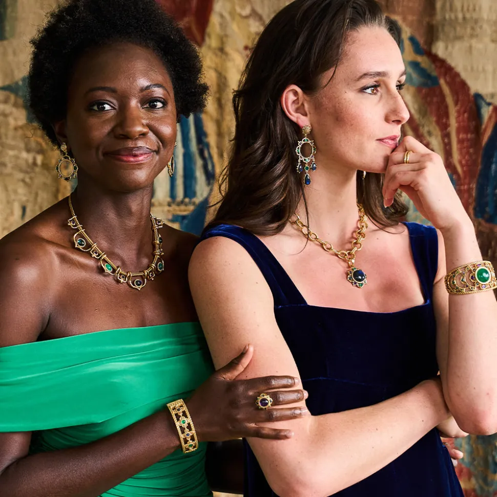Half-Parisian, half-Texan, Capucine De Wulf’s unique upbringing was the inspiration for her namesake jewelry line. Her accessories combine French romance with an American sensibility. The Contessa Dangle Earrings draw inspiration from the opulence of Byzantine courts, featuring Moorish silhouettes adorned with amethyst, blue labradorite, and green onyx gemstones. Embellished with ornate golden trimmings and finished with gilded berry posts, this captivating pair embodies radiance, artistry, and regal allure.