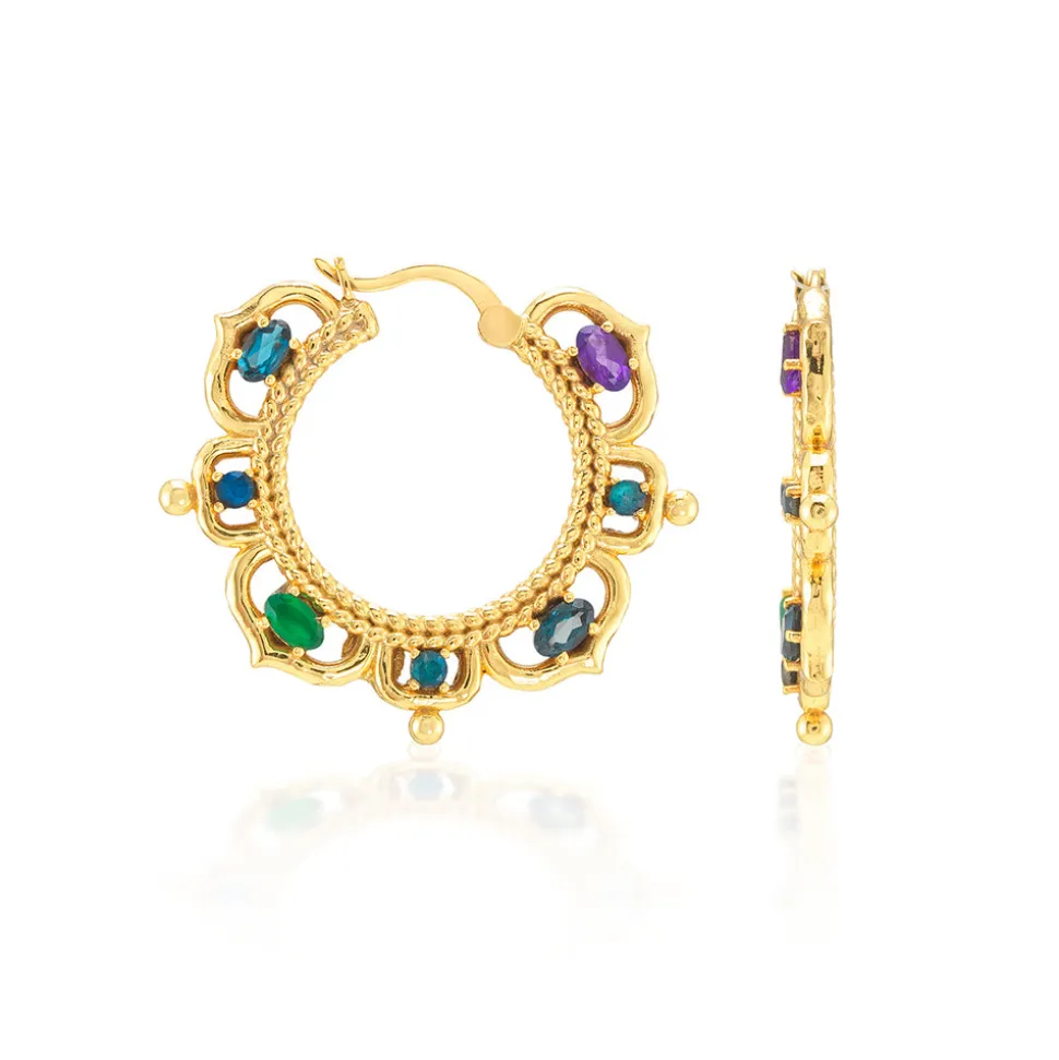 Half-Parisian, half-Texan, Capucine De Wulf’s unique upbringing was the inspiration for her namesake jewelry line. Her accessories combine French romance with an American sensibility. The Contessa Hoop Earrings reimagine the classic hoop with ornate Byzantine detailing and colorful gemstones of blue labradorite, green onyx, and amethyst. Framed in gleaming gold, these statement hoops bring a regal touch and bold femininity to every occasion—from the boardroom to the ballroom.