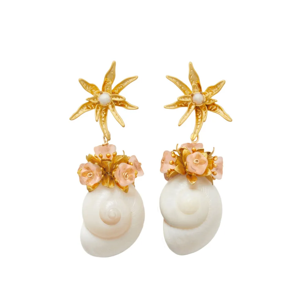 Hand-made. Featherweight. Moon shells. Pink glass tulips. 24K antique gold-plated flower toppers. Mini freshwater pearls. Stainless steel hypoallergenic posts.