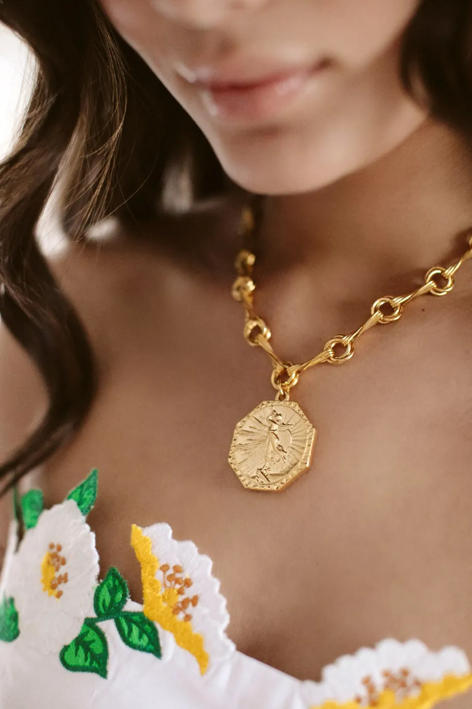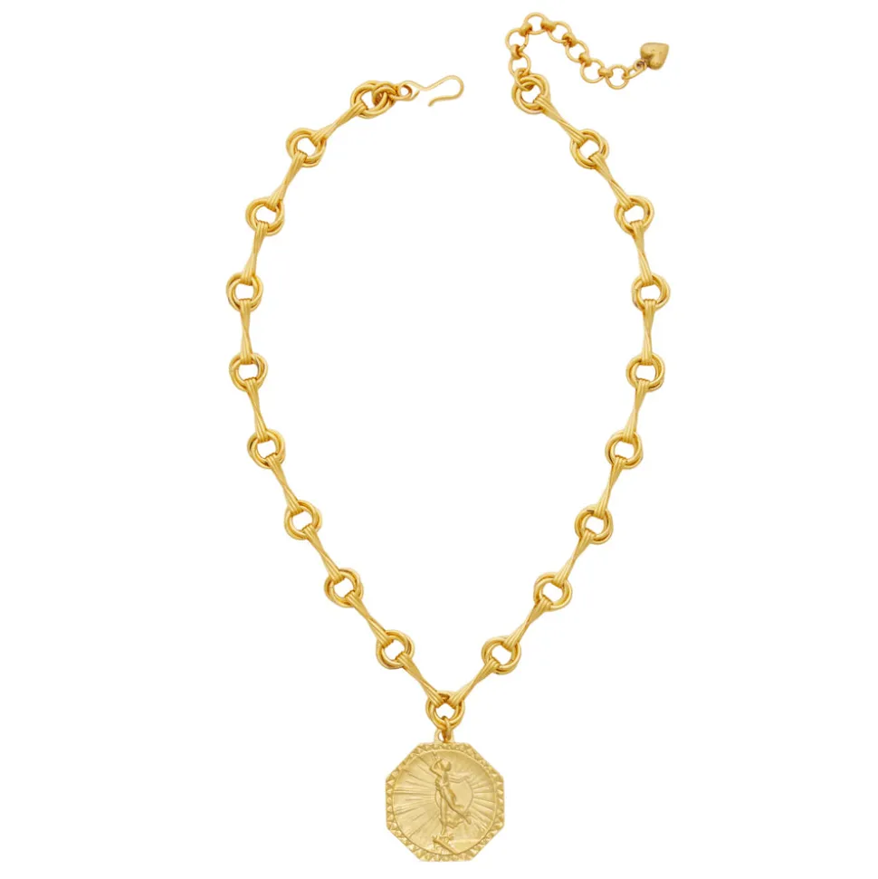 Hand-made. Adjustable. 24k antique gold-plated twist chain. Gold-plated medallion. Hook closure.