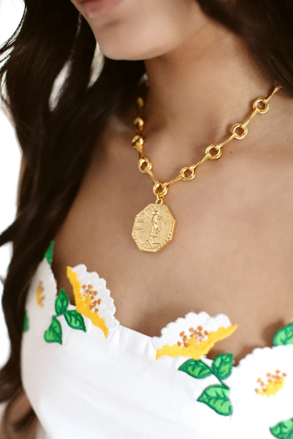 The mother-daughter duo behind Brinker + Eliza combine their experience in metalsmithing and fashion to create incredibly unique jewelry that feels custom-made. Employing pearls, shells, and earth’s most prized organic forms, these are pieces to be not just worn but treasured. The Coraline Necklace is that effortlessly cool piece you’ll reach for daily. A 24k antique gold-plated twist chain holds a bold medallion, offering timeless texture and luminous shine with every wear.
