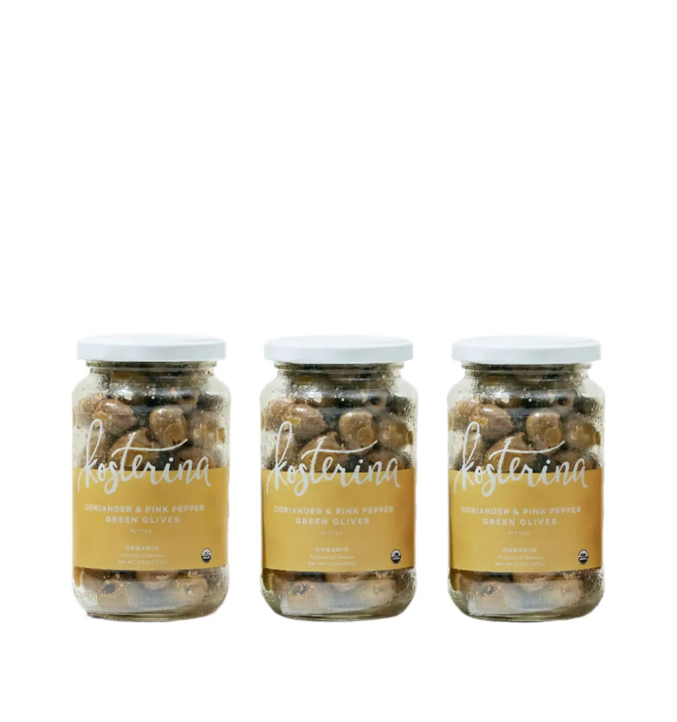 1 bottle of the brand’s highest polyphenol extra virgin olive oil (375 ml), 1 bottle of walnut balsamic vinegar (375 ml), 1 jar of Greek Herb Kalamata Olives (6.7oz), 1 jar of Coriander and Pink Pepper Green Olives (6.7oz).