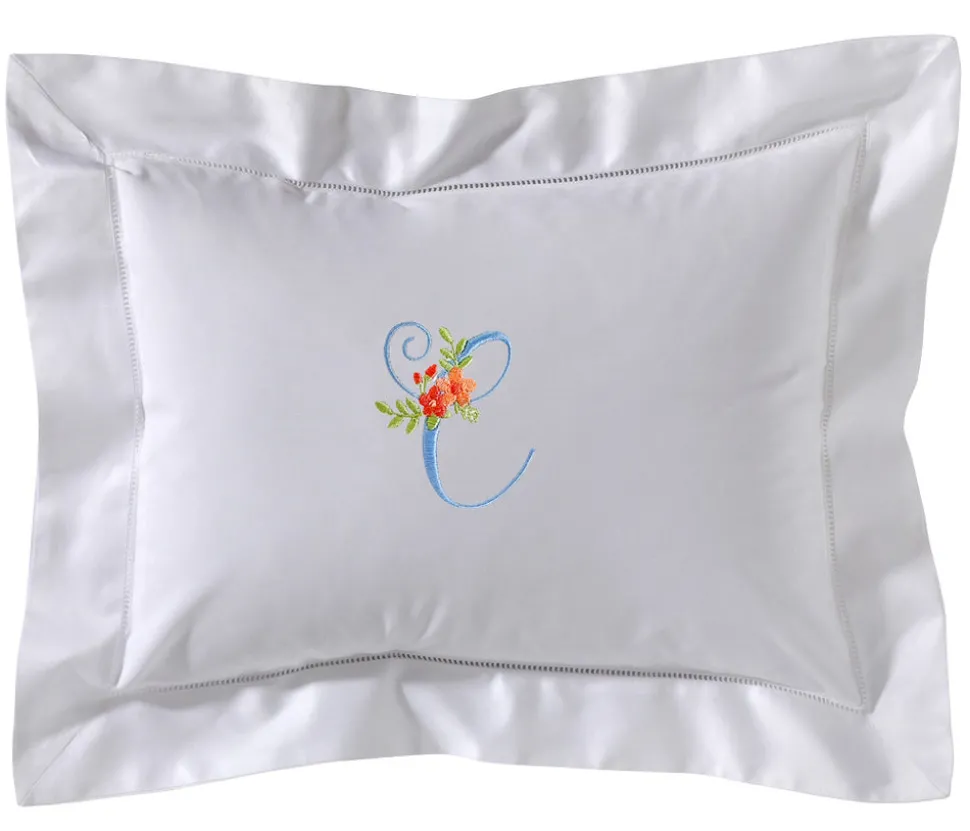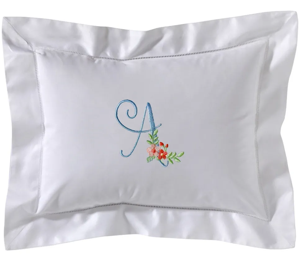Embracing a European aesthetic of hand embroidery with elegant touches of cotton lace, Jacaranda Living produces a wide variety of high quality luxury linens—for bath, table, sleepwear, and more that feel as good as they look in your home or wardrobe. The plain white Cotton Percale Boudoir Pillow Cover arrives with a hemstitch border and flange edge. Choose the design that will help enliven your bedroom, living room, or baby’s room and personalize it further with a floral font initial.