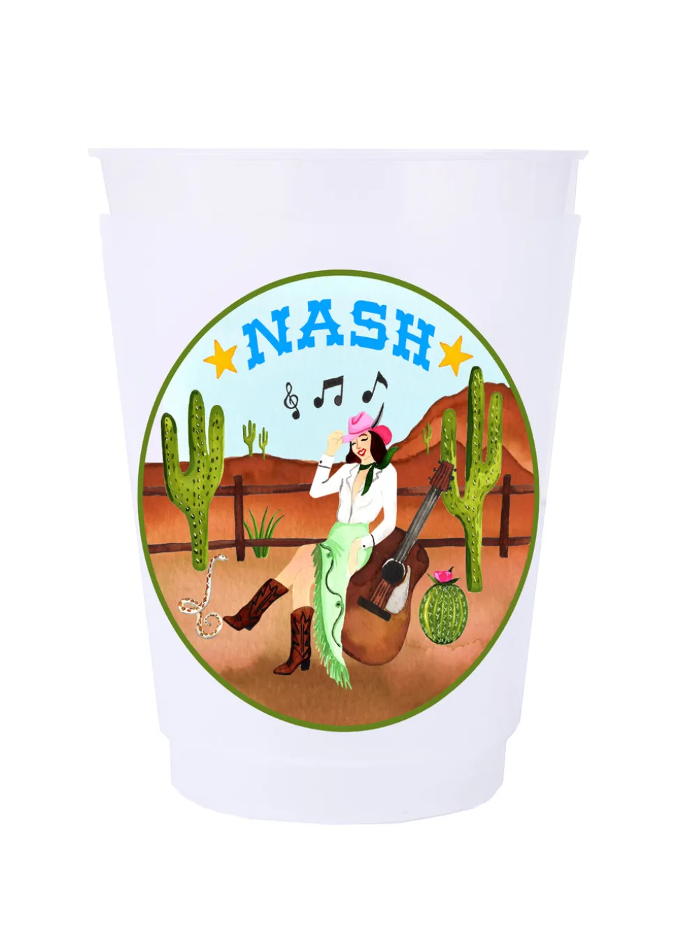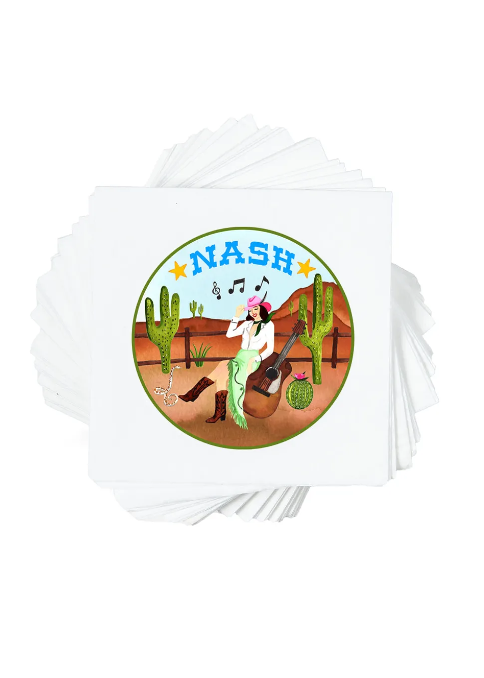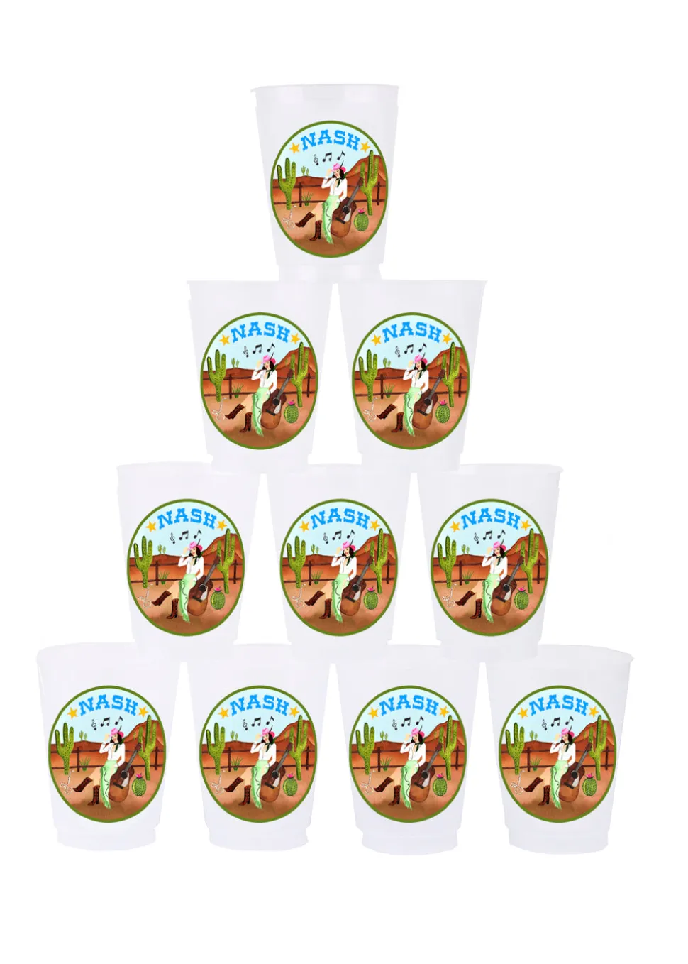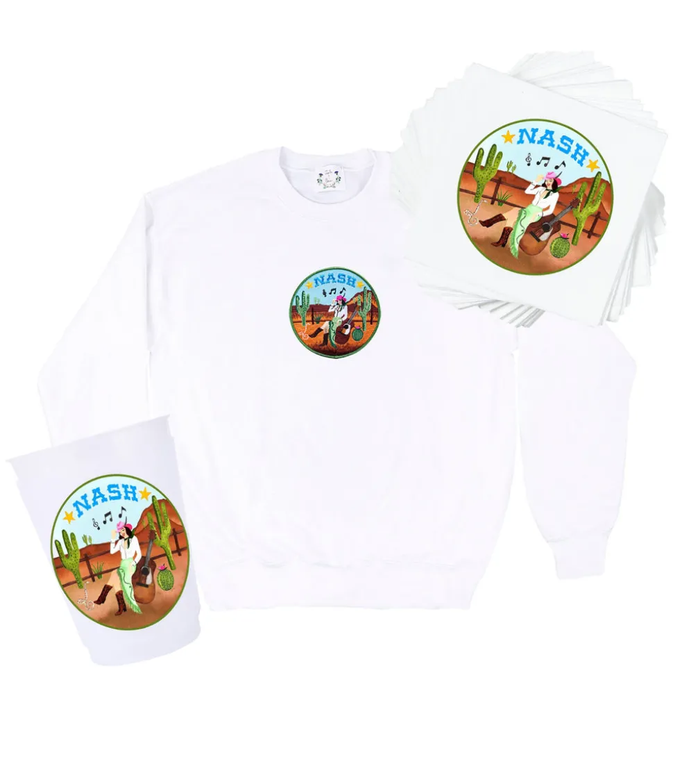 Launched in 2020 by Alexandra Pijut, Thistle and Briar Studio was born of her lifelong love of art and the desire to create hand-painted, whimsical designs for clients to cherish. Elevate your wedding, bachelorette, or special event with a personalized crest that is certain to leave a lasting impression. This exclusive Over The Moon x Thistle and Briar Studio crest features a Western landscape with a cowgirl and her guitar. Accented with cacti, a snake, and grasses, this crest is perfect for a Western-themed bachelorette with all your belles. Personalize this design with your destination, which will stand out on these cups, cocktail napkins, and patch sweatshirts. Now it’s your party.