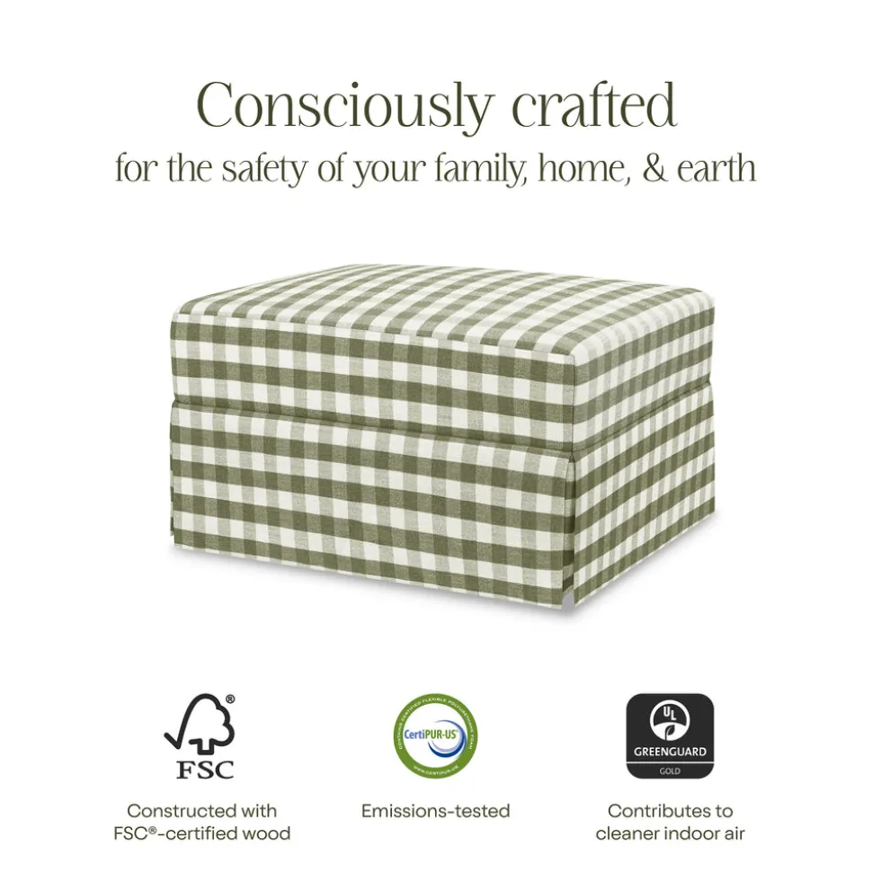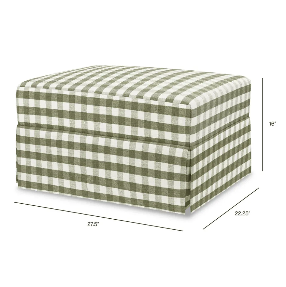 Made to treasure, Namesake brings quiet sophistication to the nursery and beyond. Imbuing heirloom-quality craftsmanship with modern sensibility, these timeless essentials are made to be cherished for years to come. The Crawford Gliding Ottoman in Moss Green Gingham brings classic charm and coordinated comfort to the nursery. Designed to pair with the Crawford Glider, this ottoman features a smooth gliding base that moves in sync with the chair—creating a gentle rhythm to help soothe baby and unwind together.
