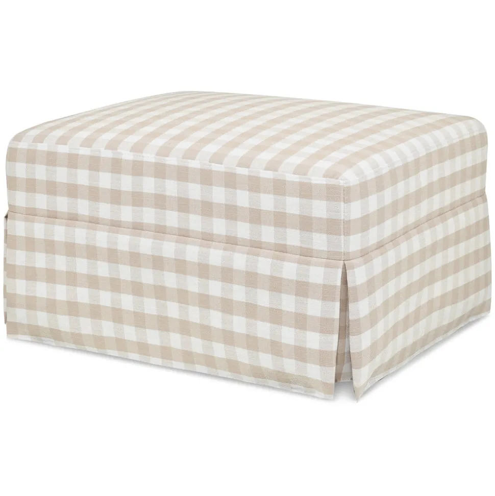 Upholstered in tan gingham fabric. Gliding base moves in tandem with the Crawford Glider for a coordinated soothing motion. Constructed with a kiln-dried hardwood frame. GREENGUARD Gold Certified.
