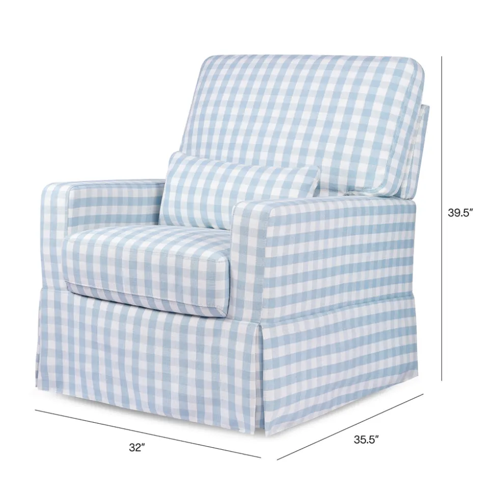 Upholstered in soft blue gingham fabric with a waterfall skirt and structured track arm silhouette. Includes plush pillowback, lumbar support pillow, and wide seat. Built with 360° swivel and smooth gliding functionality. Kiln-dried hardwood frame. GREENGUARD Gold Certified.