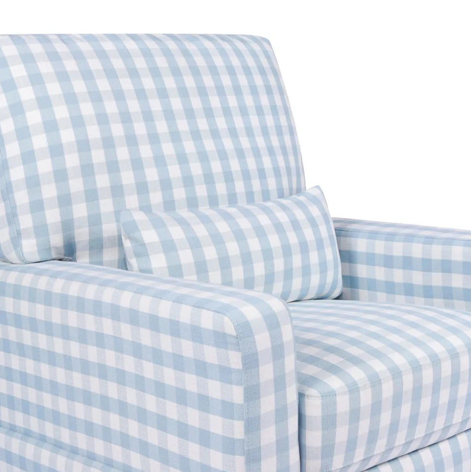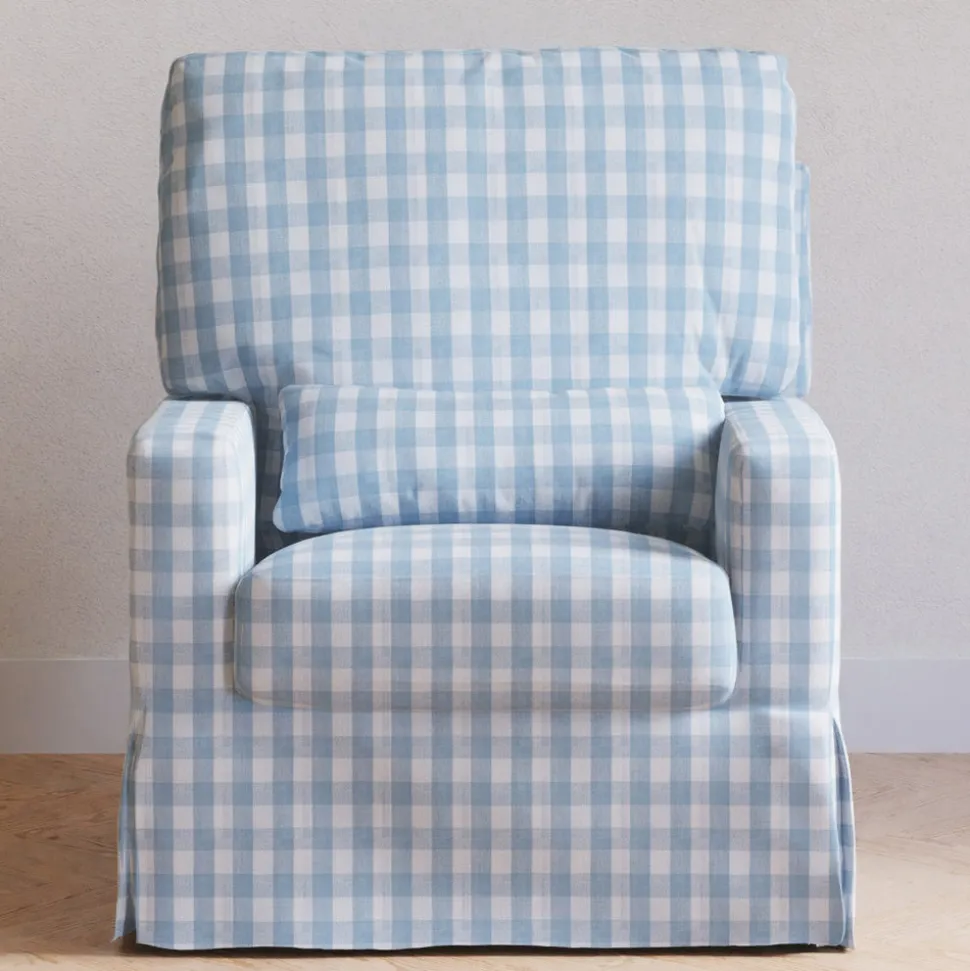 Made to treasure, Namesake brings quiet sophistication to the nursery and beyond. Imbuing heirloom-quality craftsmanship with modern sensibility, these timeless essentials are made to be cherished for years to come. The Crawford Pillowback Comfort Swivel Glider in Blue Gingham blends traditional charm with everyday functionality. Featuring a waterfall skirt and tailored track arms, its plush pillow back, lumbar cushion, and wide seat offer superior comfort—while smooth gliding and 360° swivel motion provide gentle, restful movement for both baby and parent.