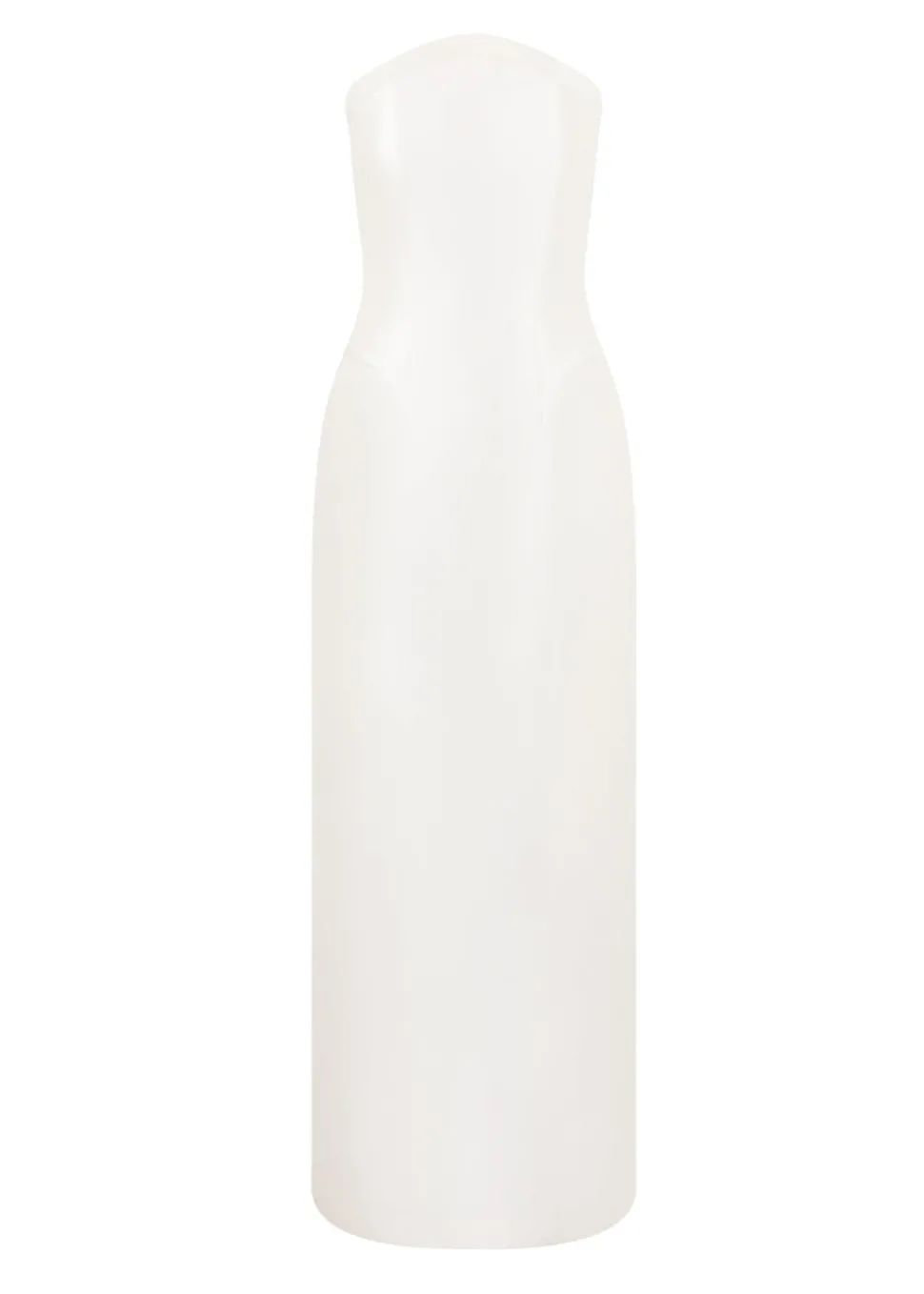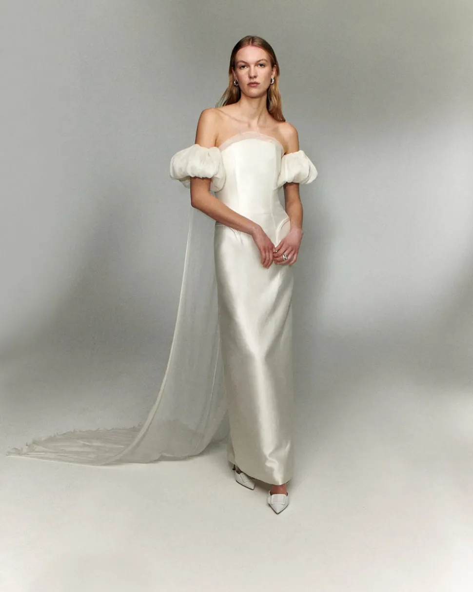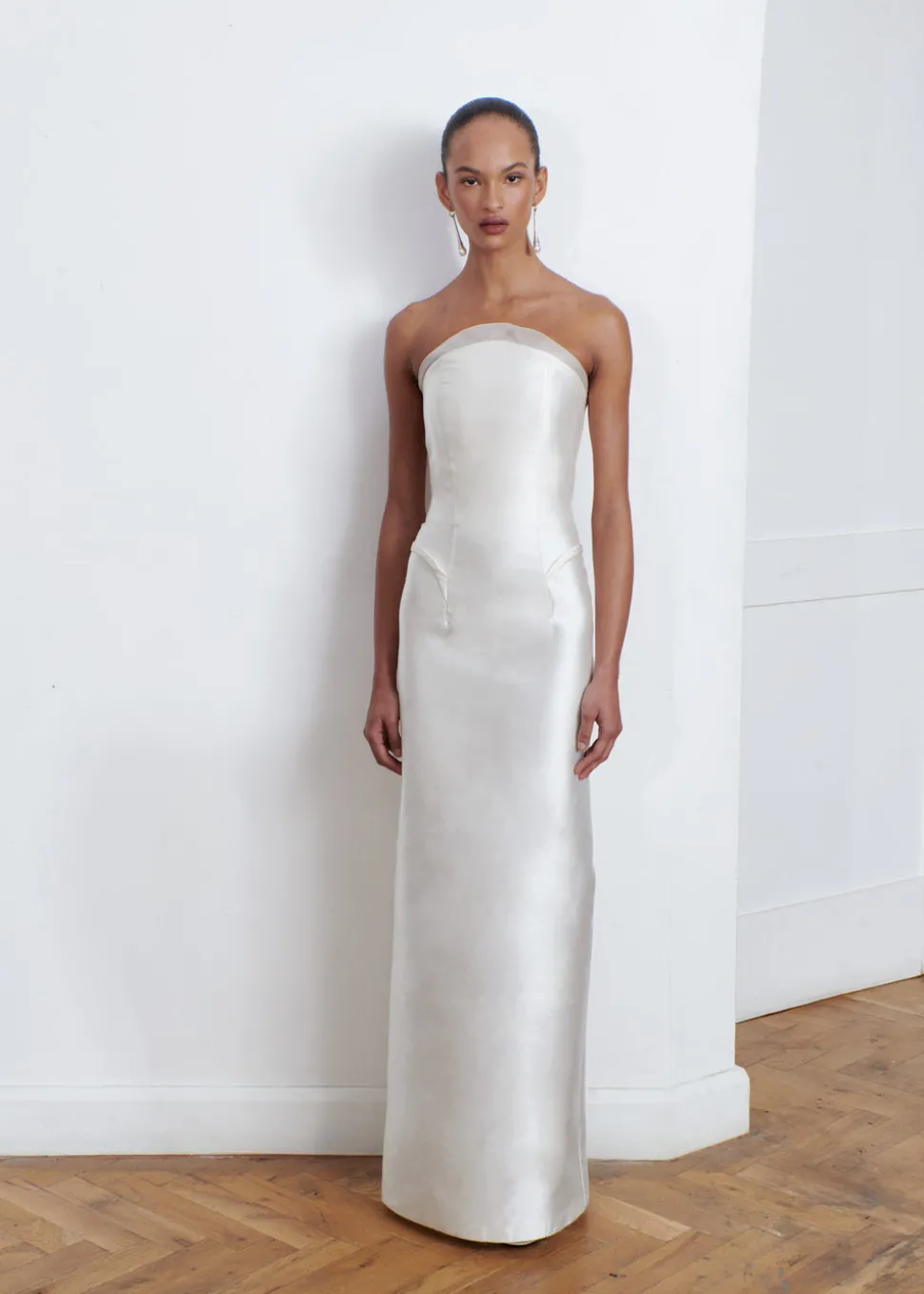 Handmade at its London atelier, The OWN Studio’s signature style combines pared-back, contemporary silhouettes with unexpected vintage details resulting in considered, minimal styles for the modern woman. The label brings a fresh and contemporary approach to wedding and evening wear. The elevated crescent shaped neckline on the Crescent Strapless Silk Mikado Gown | STYLE 118 is edged with silk organza and is echoed in the silk pocket detail just below the waist. Fully corseted for additional support and structure, this is a minimalist silhouette crafted in signature silk mikado fabric that is completely effortless. Pair with silk chiffon and organza cape for a refined bridal look.
