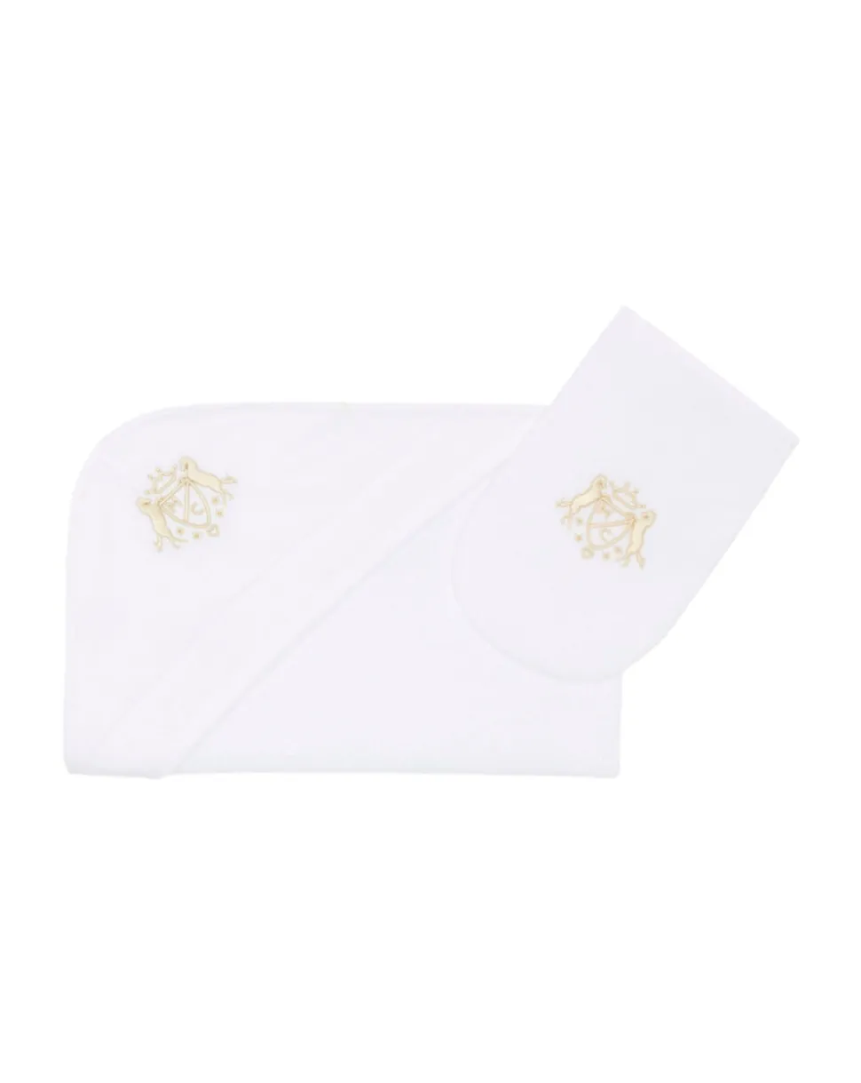 100% cotton. Matching items available for nursery. Features woven cotton trim and embroidered crest design.
