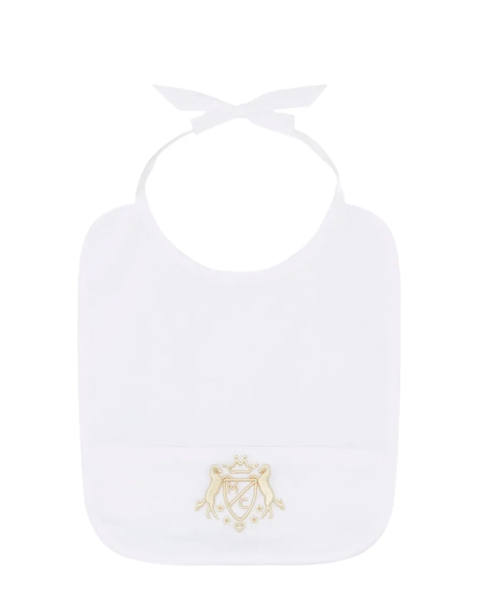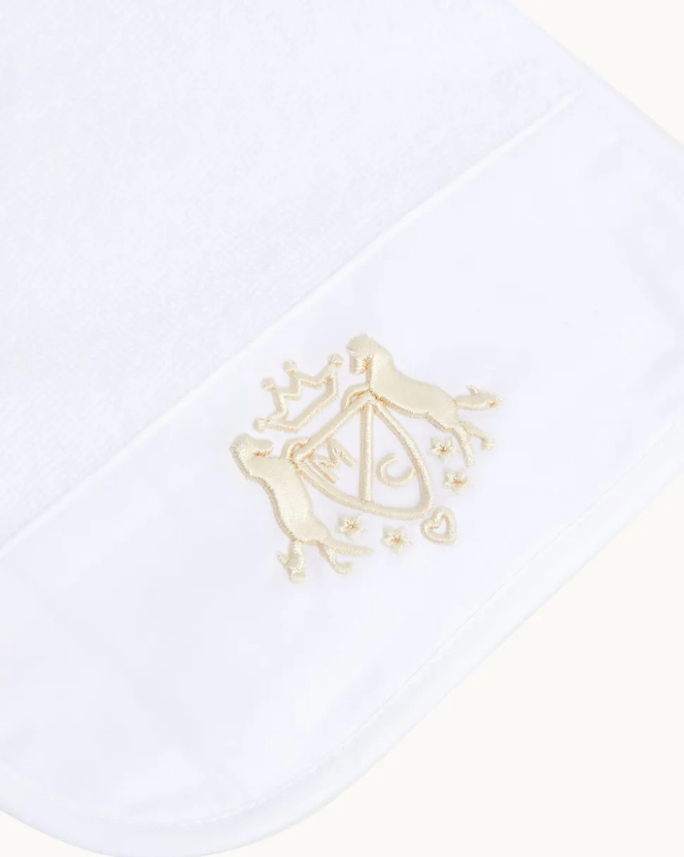 Princess Marie-Chantal of Greece’s eponymous label is known internationally for its unmatched style and the quality of materials—like their organic, hand-picked Pima cotton—which lies at the heart of their baby essentials and contemporary children’s clothing. The Crest Bib features the brand’s heritage crest, a signature design inspired by Princess Marie-Chantal’s five children and her favorite childhood novel. The stars and heart represent her five children: four blue stars for her sons and a pink heart for her daughter. The two horses are inspired by both her own and her children’s books.