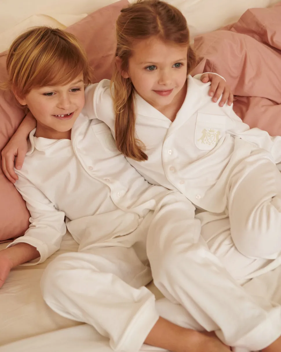 Princess Marie-Chantal of Greece’s eponymous label is known internationally for its unmatched style and the quality of materials—like their organic, hand-picked Pima cotton—which lies at the heart of their baby essentials and contemporary children’s clothing. The Crest Pyjama in Child features the brand’s heritage crest, a signature design inspired by Princess Marie-Chantal’s five children and her favorite childhood novel. The stars and heart represent her five children: four blue stars for her sons and a pink heart for her daughter. The two horses are inspired by both her own and her children’s books. The most ideal for bedtime.