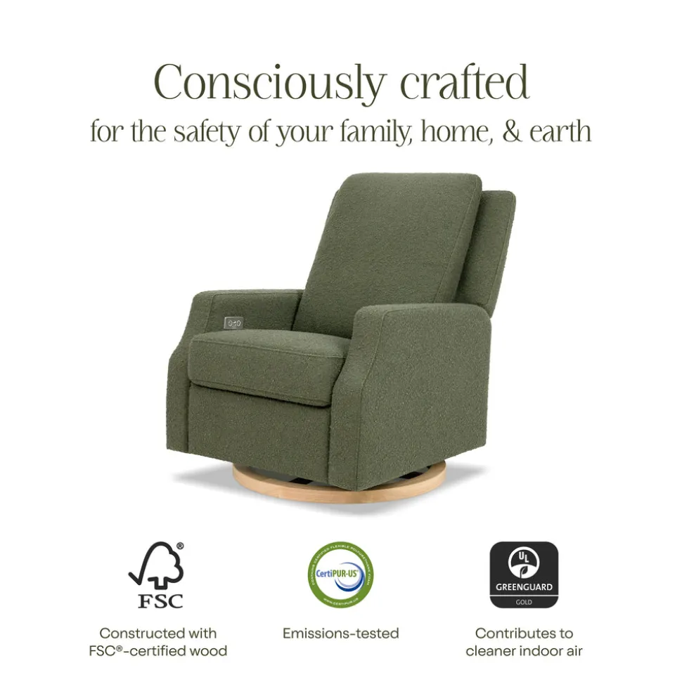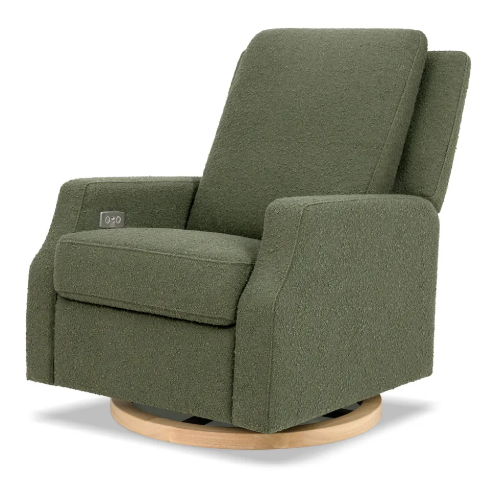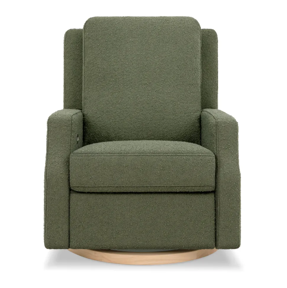 Upholstered in olive performance bouclé with a light wood base. Features a plush back cushion, wide seat, and smooth electronic recline mechanism. Provides back-and-forth gliding and 360° swivel motion. Built with a kiln-dried hardwood frame. GREENGUARD Gold Certified.