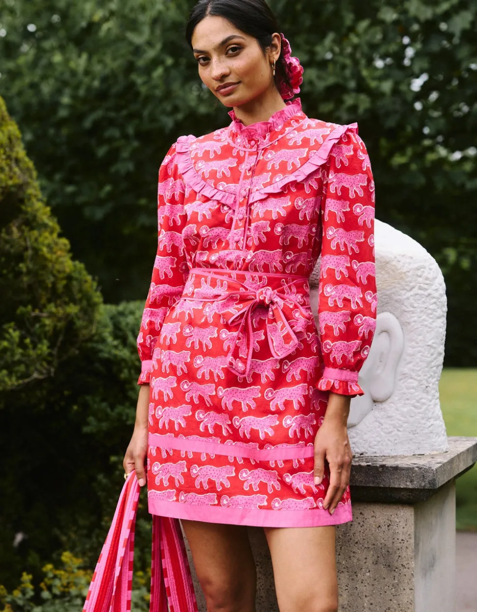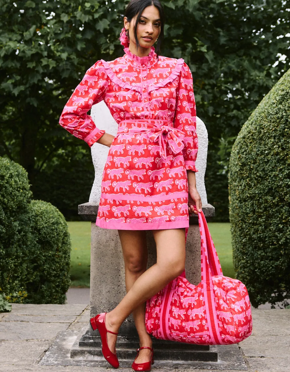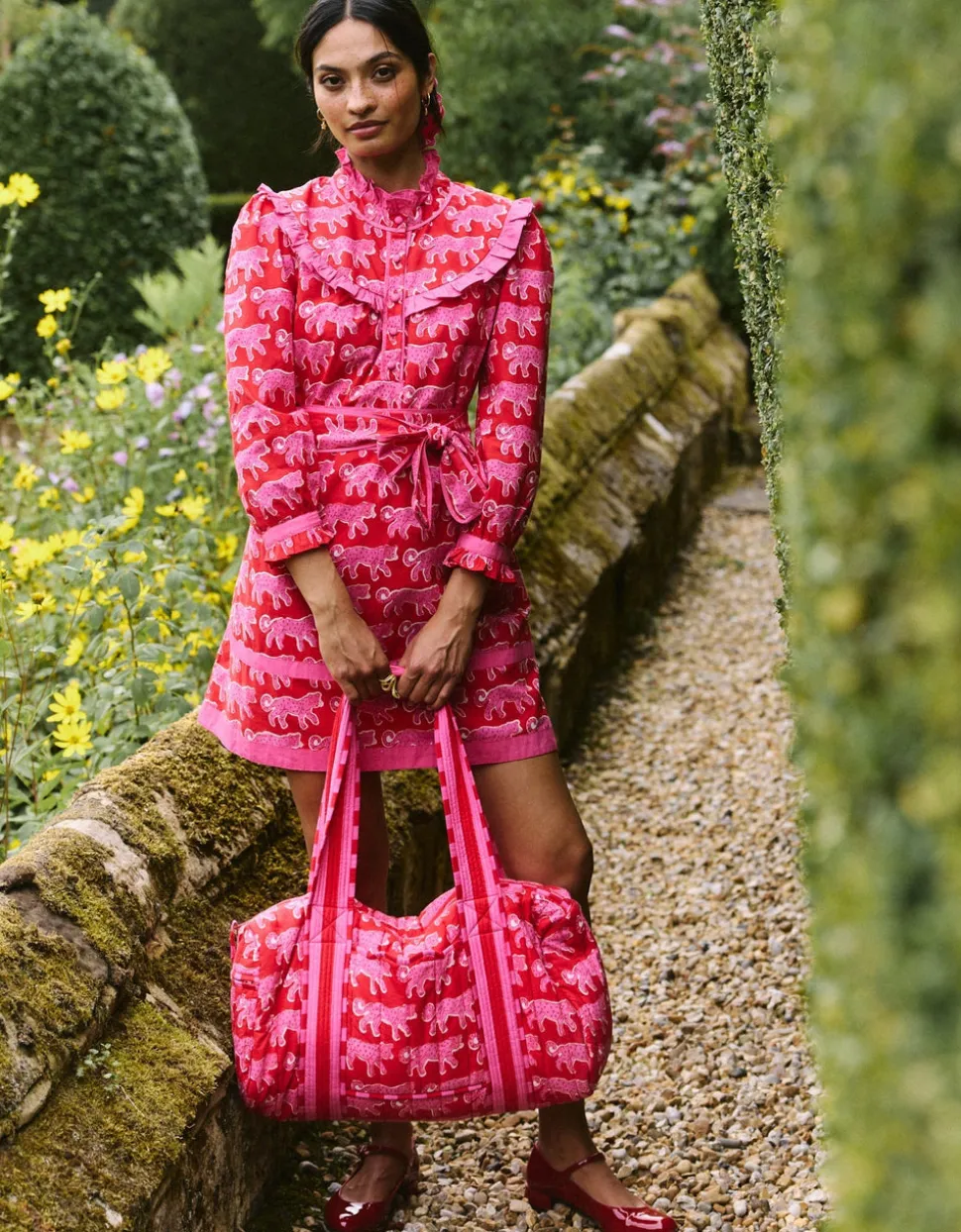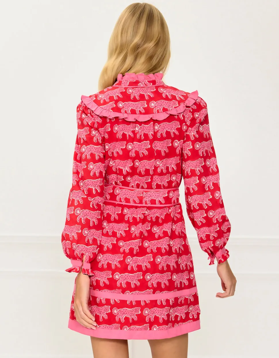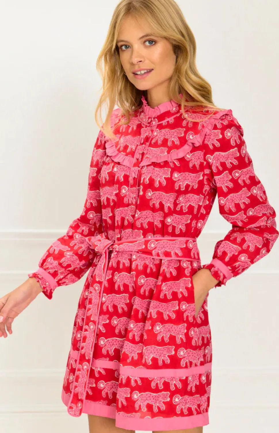 Color and creativity are the foundations of Pink City Prints, a brand inspired by founder Molly Russell’s life in Jaipur. In her inimitable dresses, you’ll find centuries of craft knowledge, expressed through unmatched quality and traditional techniques, like hand embroidery, block printing, and hand-looming. Crafted in the playful, hand block-printed crimson leopard design, the Bianca Mini is a fun and fashion-forward addition to your wardrobe. With a flattering, throw-on shape and bold pink trim details, it makes a confident statement whether worn loose or belted at the waist. Style with Mary Janes for everyday charm, or pair with knee-high boots and the matching quilted Penny Jacket for a statement autumn look.