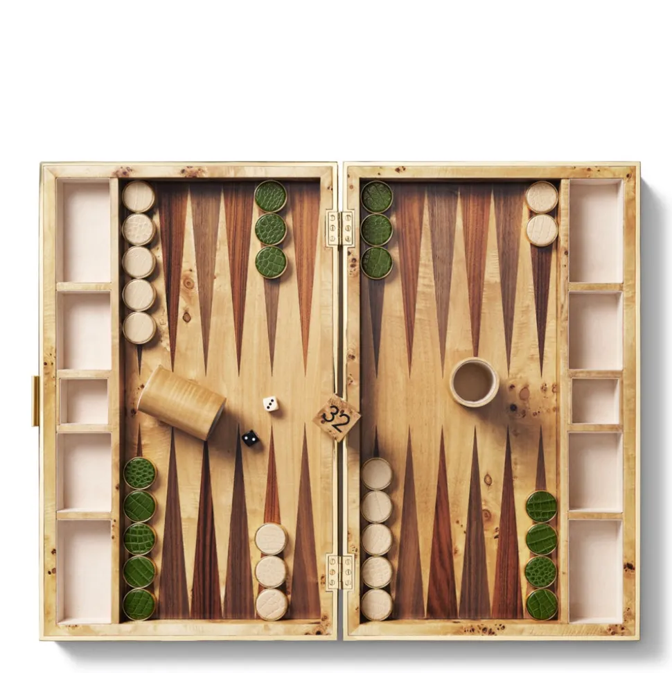 Effortless, beautiful living is what’s important to Aerin Lauder. That ease and refinement shines through in every detail of her collections of beauty products, home decor, and fashion accessories. Crafted in Italian croc embossed leather, with brass hardware and a wood veneer, the Croc Leather Backgammon Set with Dice is an approachable and sightly way to approach the game. Looks ideal on the coffee table, but also tucks away neatly when it’s time to move on to more serious things.