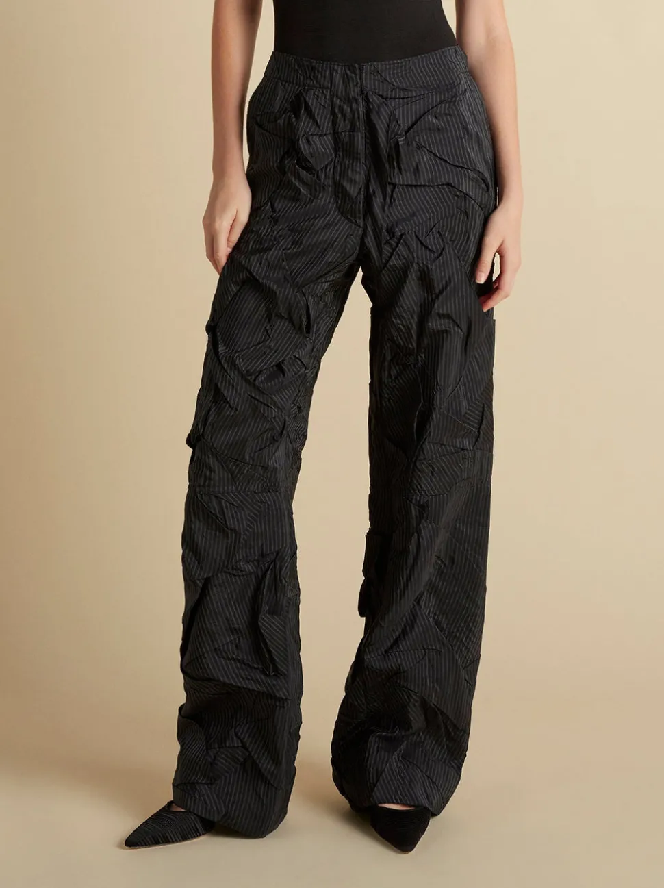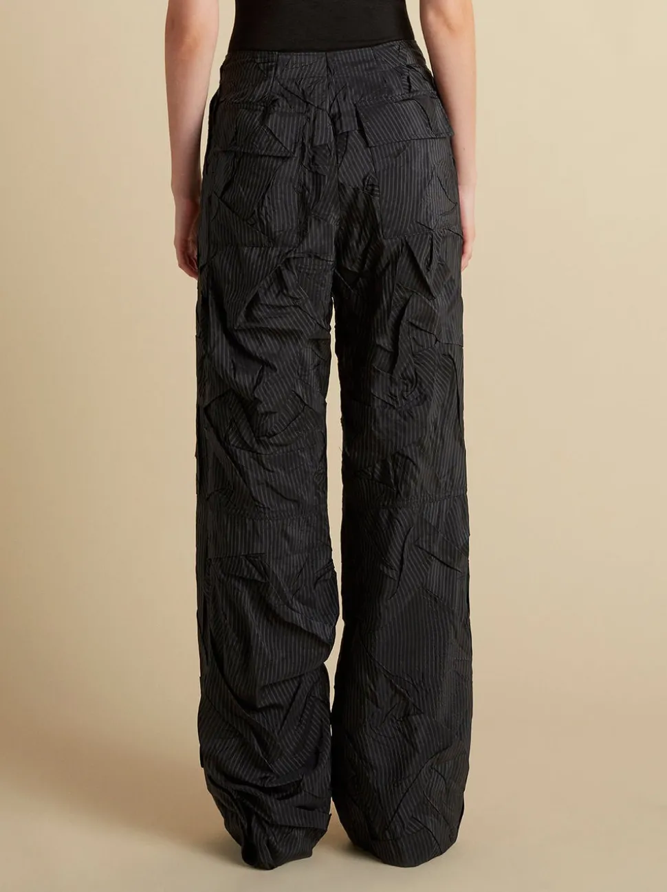 Founded in 2016 by sisters Marina and Francesca Moscone, the label gravitates toward a tactile approach, twisting and draping fabrics by hand to create a softly seductive design using custom jacquards, fil-coupés, and silk wools, all exclusively developed in Italy, rendered in precise shapes and tailoring. The Crushed Pinstripe Parachute Trouser in Navy showcases this artistry with a subtly textured fabric featuring a tonal pinstripe and a relaxed, fluid silhouette. A center front button-fly closure grounds the design with classic tailoring detail.