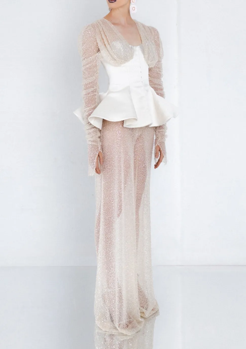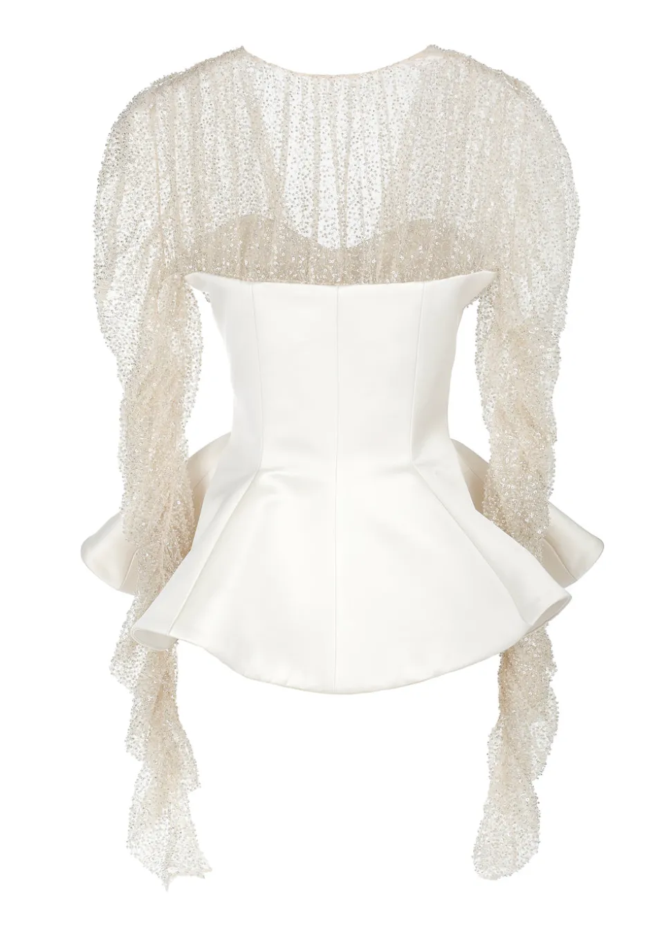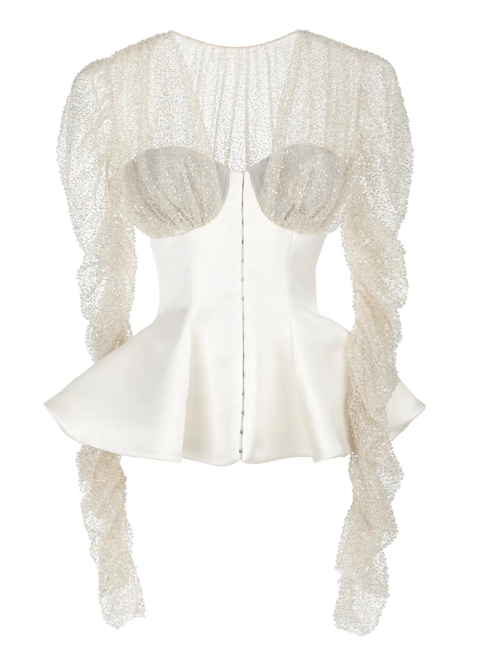 Founded by design duo Jeffrey Taylor and Roy Carey, JEOFROI is a demi couture-minded brand based in Atlanta with standout occasion-wear at its forefront. This ivory satin peplum top is a showstopper. Set with hand-beaded yolk and softly rouged vented sleeve, the Crystal Peplum Corset is fitted to the body and boned throughout with hook and eye closures at center front.