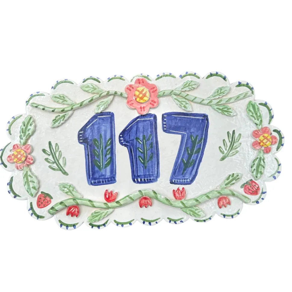 Self-taught artist Tricia Lowenfield crafts one-of-a-kind whimsical pieces that will immediately become beloved family treasures. Put that beautiful finishing touch on your home’s exterior with this hand-painted Custom Number Plate. Made by hand with vivid colors, it features your unique house number and adds style and charm. Please include in the notes your house number and any other specifications, including whether or not you would like holes drilled in the plate.