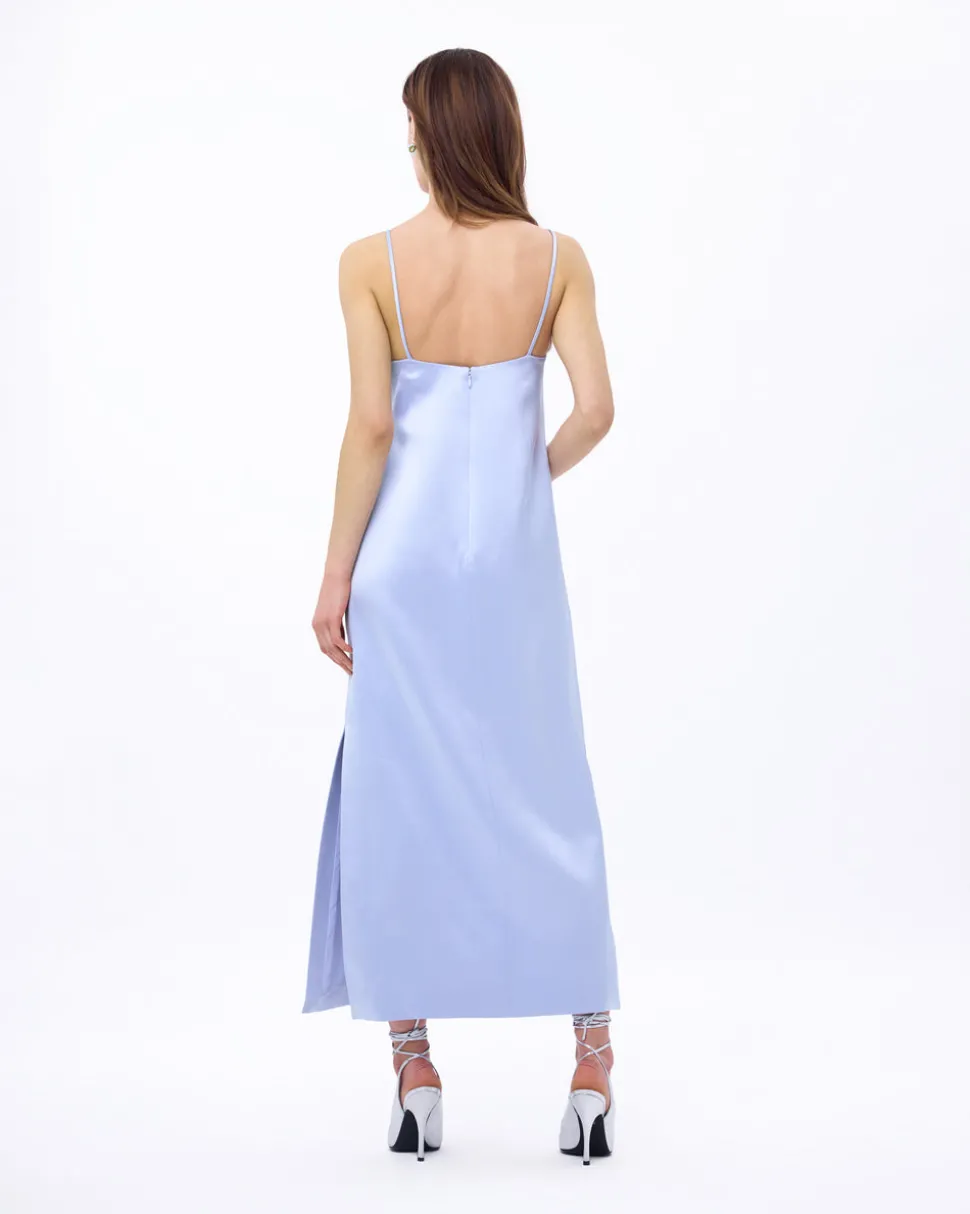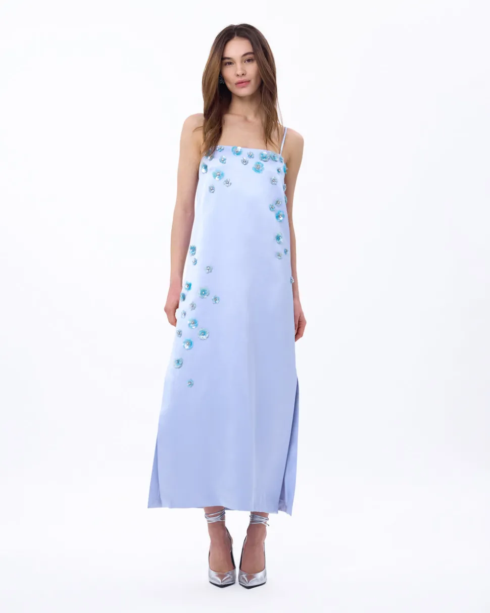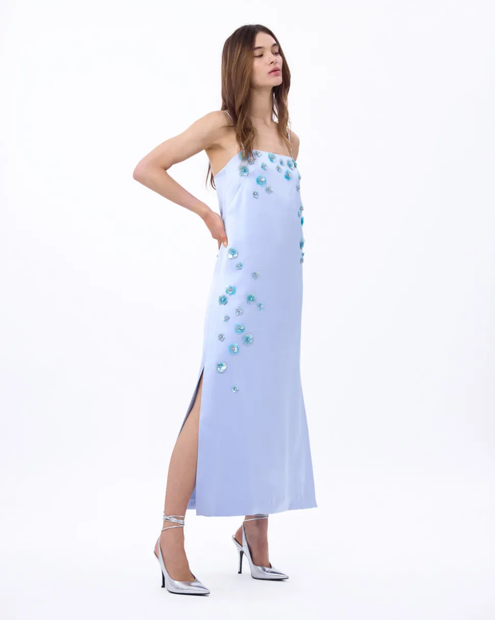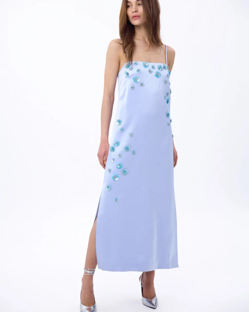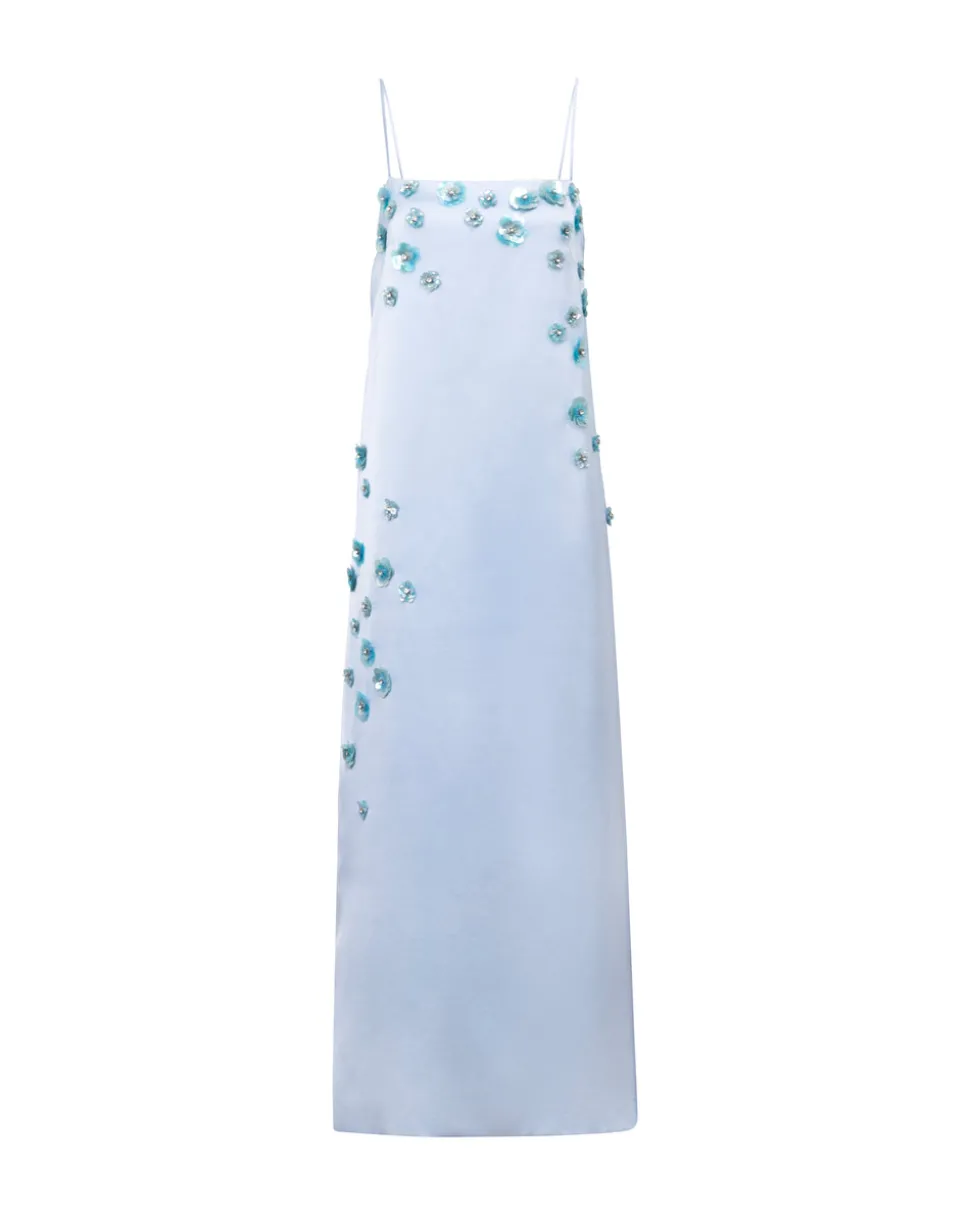 A new line from celebrity favorite Tanya Taylor, Delphine explores the designer’s alter ego, a sophisticated party girl sensibility that mixes vintage red carpet glamour with downtown cool—and just the right amount of edge. The Daisy Dress features hand-sewn 3D floral embellishments cascade down as if petals have been sprinkled all over. The embellishments twinkle with hints of aqua to punctuate the powder blue satin. The crepe back satin slip is finished off with a square neckline and spaghetti straps.