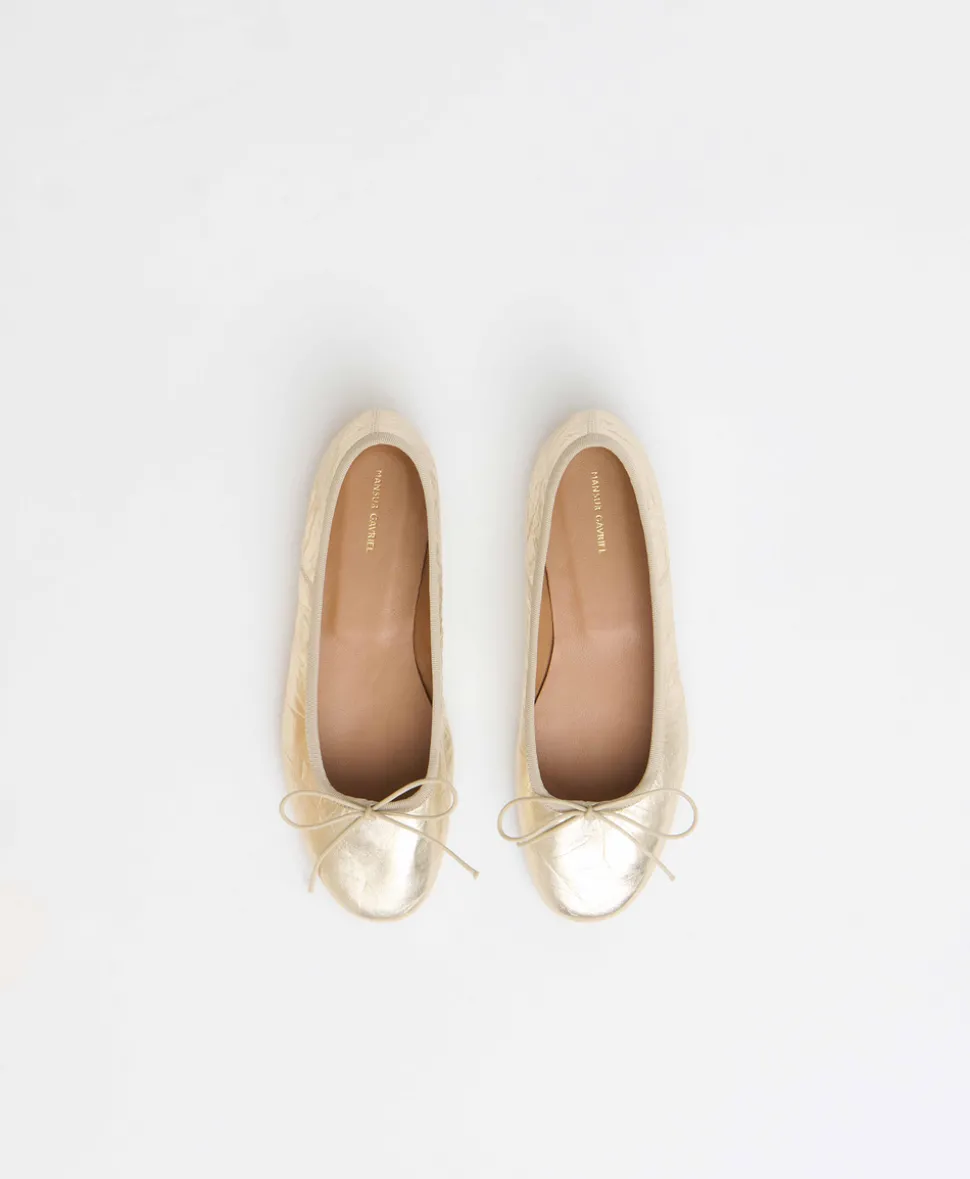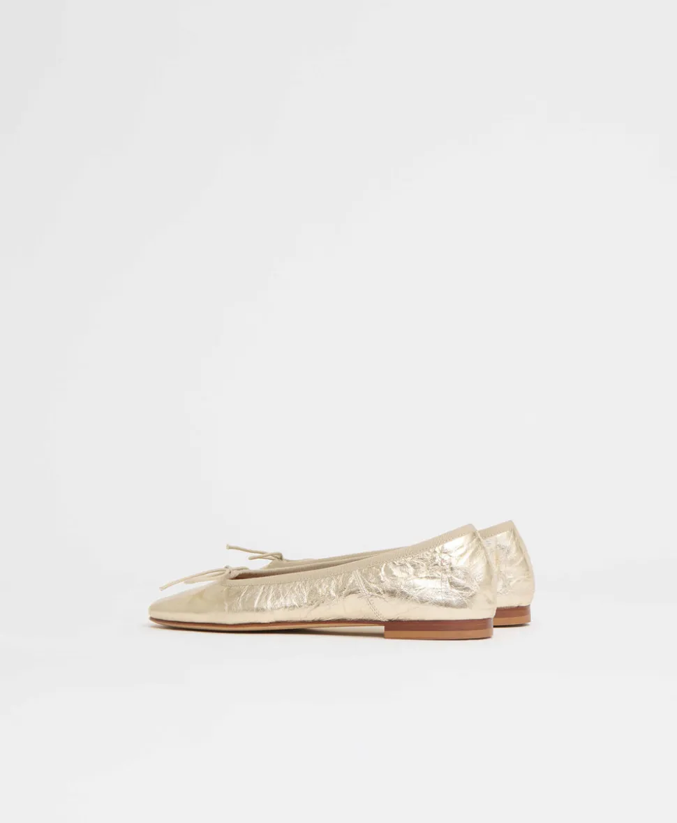 Founded in 2013, Mansur Gavriel redefines luxury through its distinctive approach to color and form. Born out of a passion for art and design, Rachel Mansur and Floriana Gavriel created two simple silhouettes—launching with just a bucket and tote. The brand’s designs, dreamt up in New York and crafted in Italy, continually challenge the notions of what expression can be. The Dance Ballerina in Crinkled Gold is an elegant reimagining of the classic ballet flat, crafted in ultra-soft Italian lambskin with a flexible sole and cushioned interior for effortless comfort and modern appeal.