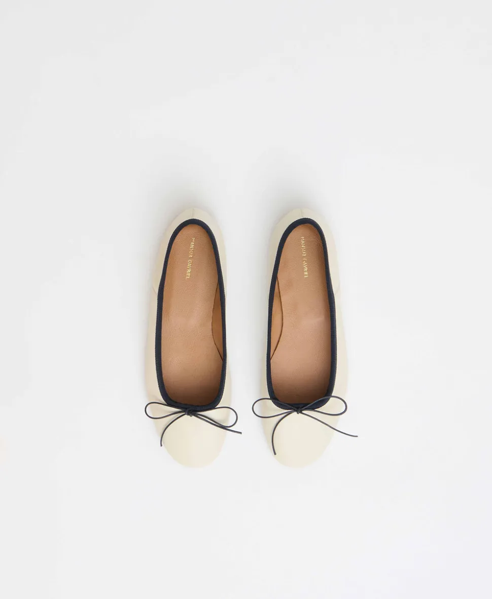 Founded in 2013, Mansur Gavriel redefines luxury through its distinctive approach to color and form. Born out of a passion for art and design, Rachel Mansur and Floriana Gavriel created two simple silhouettes—launching with just a bucket and tote. The brand’s designs, dreamt up in New York and crafted in Italy, continually challenge the notions of what expression can be. The Dance Ballerina in Jasmine/Midnight is an elegant reimagining of the classic ballet flat, crafted in ultra-soft Italian lambskin with a flexible sole and cushioned interior for effortless comfort and modern appeal.