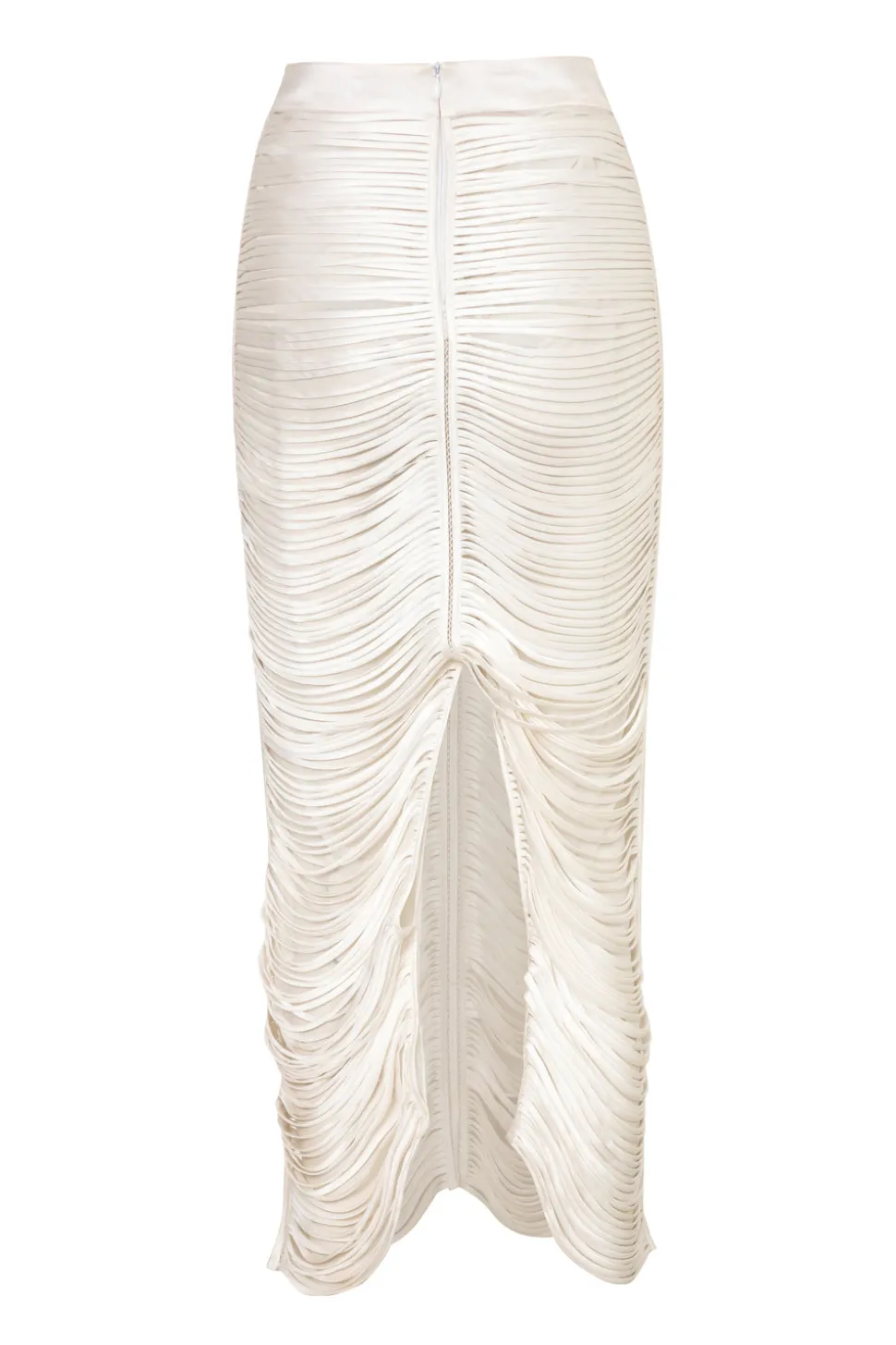 From her atelier in Barranquilla, Colombia, Francesca Miranda combines the diverse, indigenous aesthetic of her surroundings, as well as her own European roots, to produce sumptuous womenswear, bridal, and household objects, each bearing the essential spirit of artistry and craftsmanship. Bedecked fringe, the Danielle Skirt features delicate threads of Silk-Satin, cut and pieced together to achieve breathtaking movement.