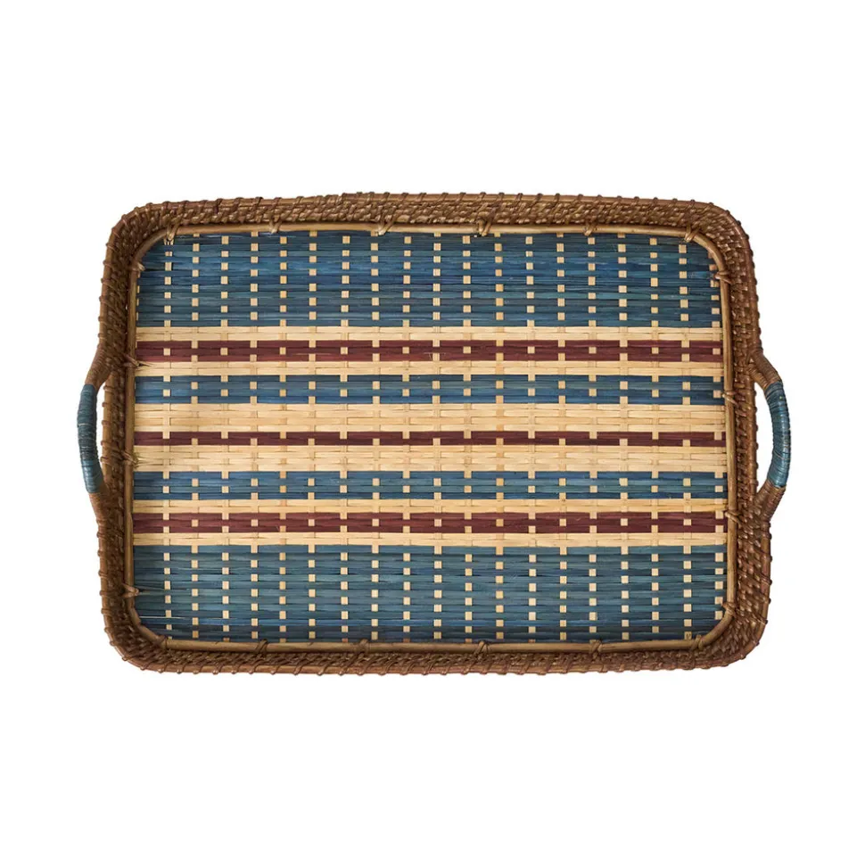 Handwoven natural cane wood. Navy stripes inspired by Scandinavian design. For serving hors d’oeuvres, snacks, or breakfast in bed. For indoor use only.