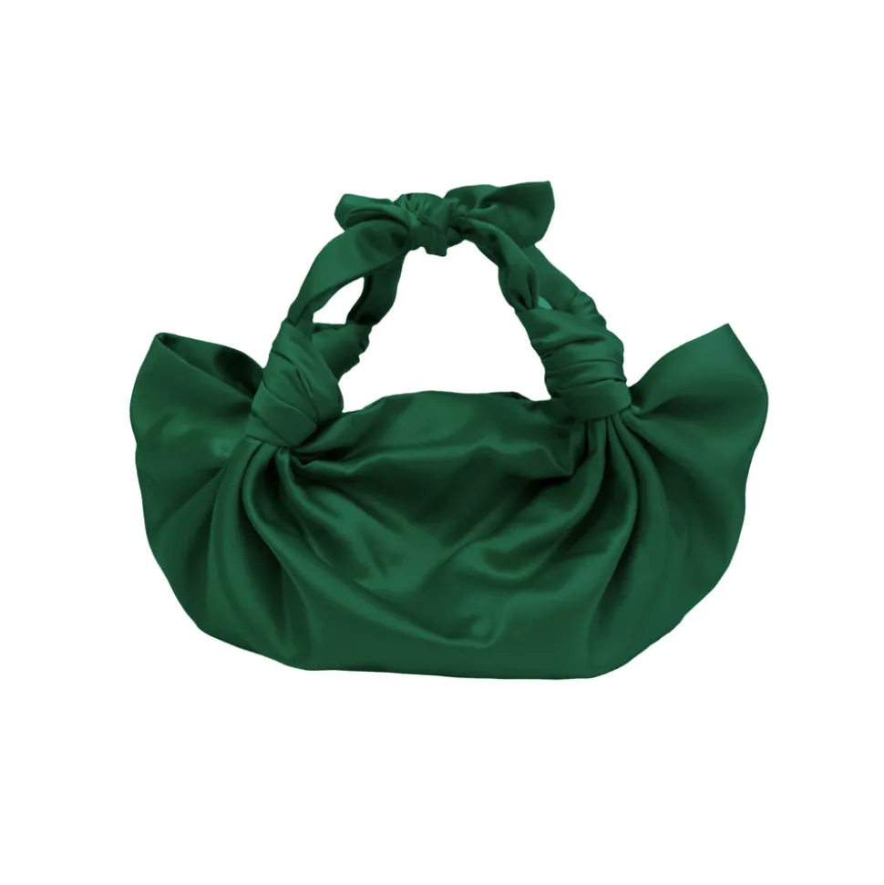 Handmade in Los Angeles, NLA Collection designs timeless, luxury pieces made with sustainable, vintage fabric. Meet your new, goes-with-everything bag for every occasion. The Dark Green NLA Silk Knot Bag is small enough to wear on your wrist and big enough to fit your phone, wallet, and all the necessities. This silky satin purse boasts small knots, interior pocket, and hidden magnet closure.